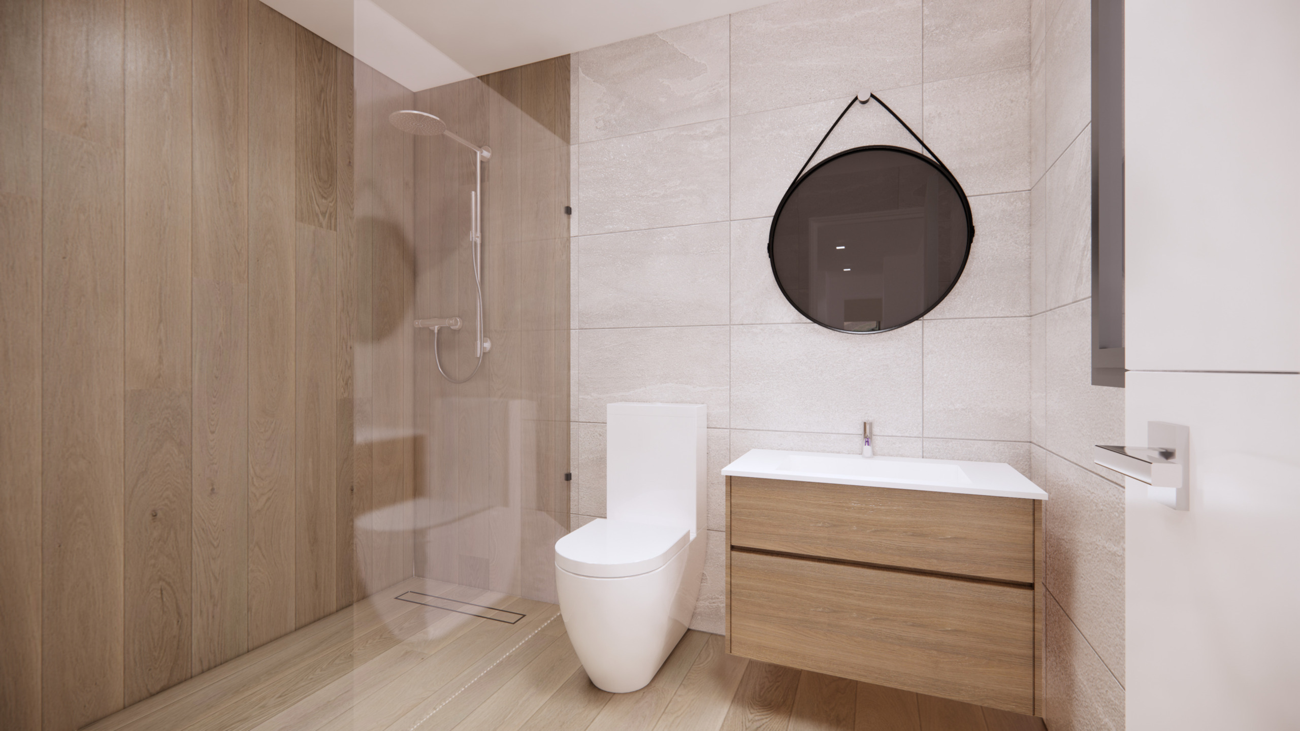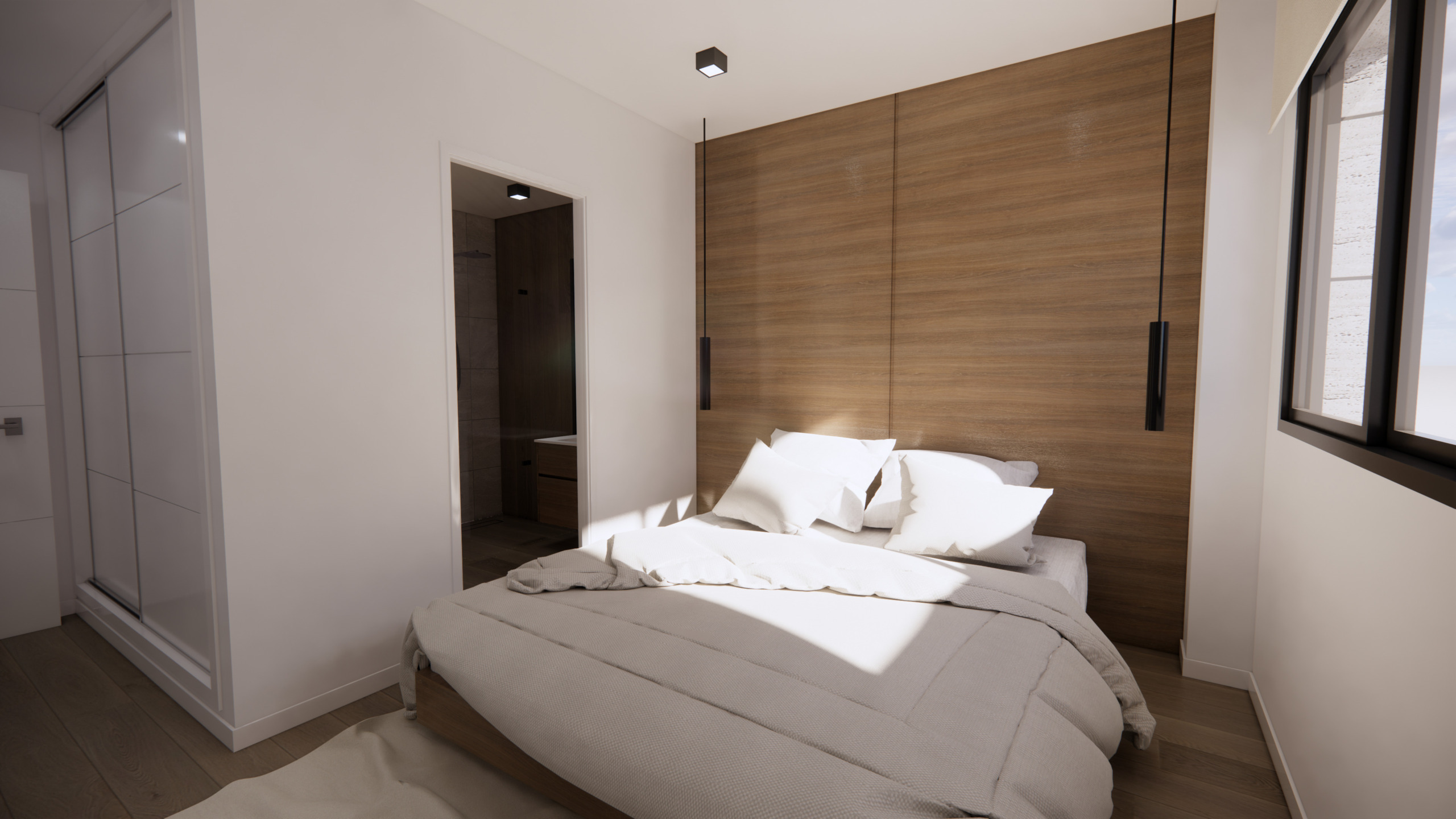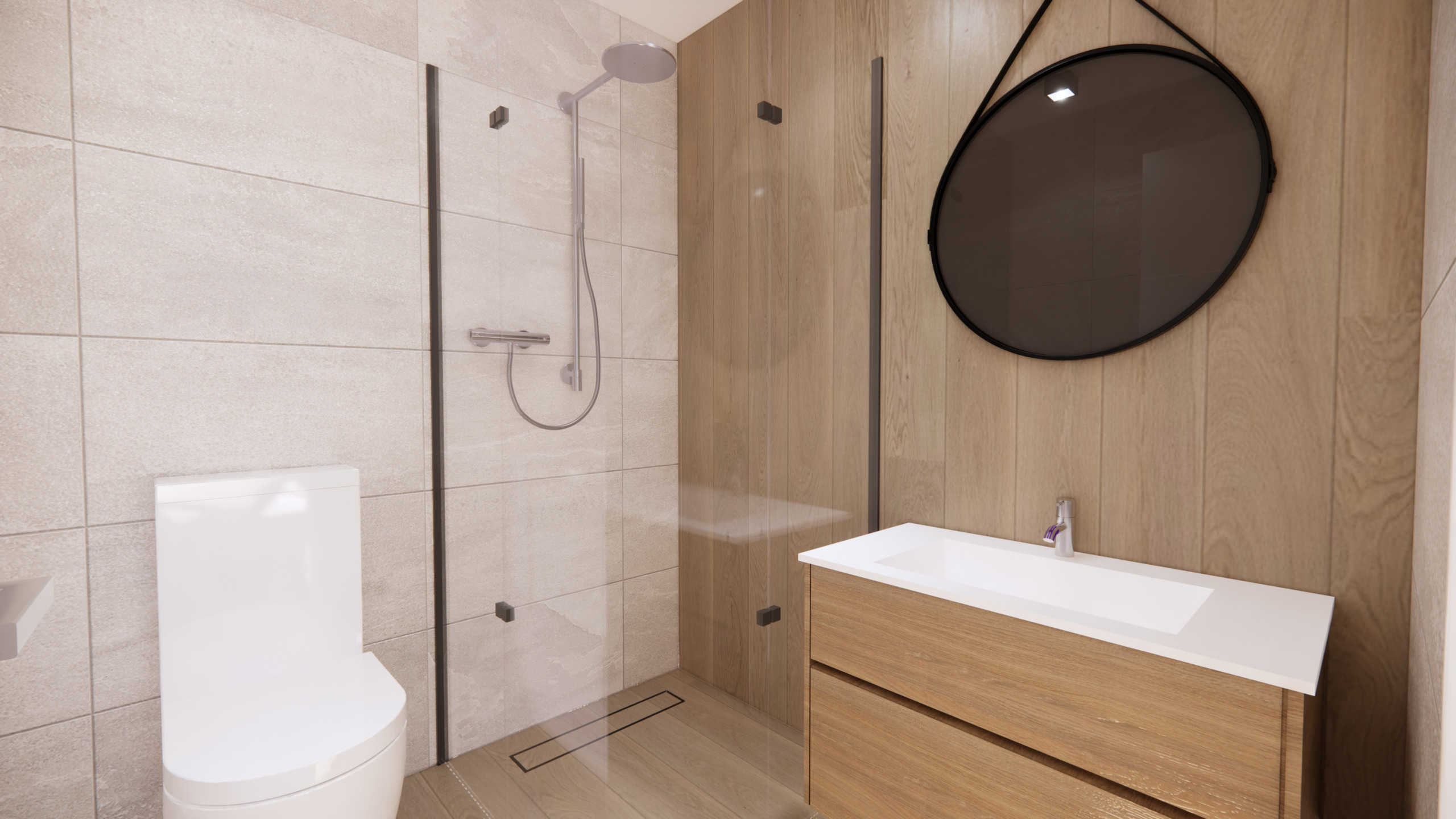 Die Schlafzimmer haben große Fenster, die viel Licht hereinlassen, und moderne, weiß lackierte Schränke. Die Bäder sind komplett mit Waschbecken, Schrank, Spiegel und Duschwand ausgestattet.