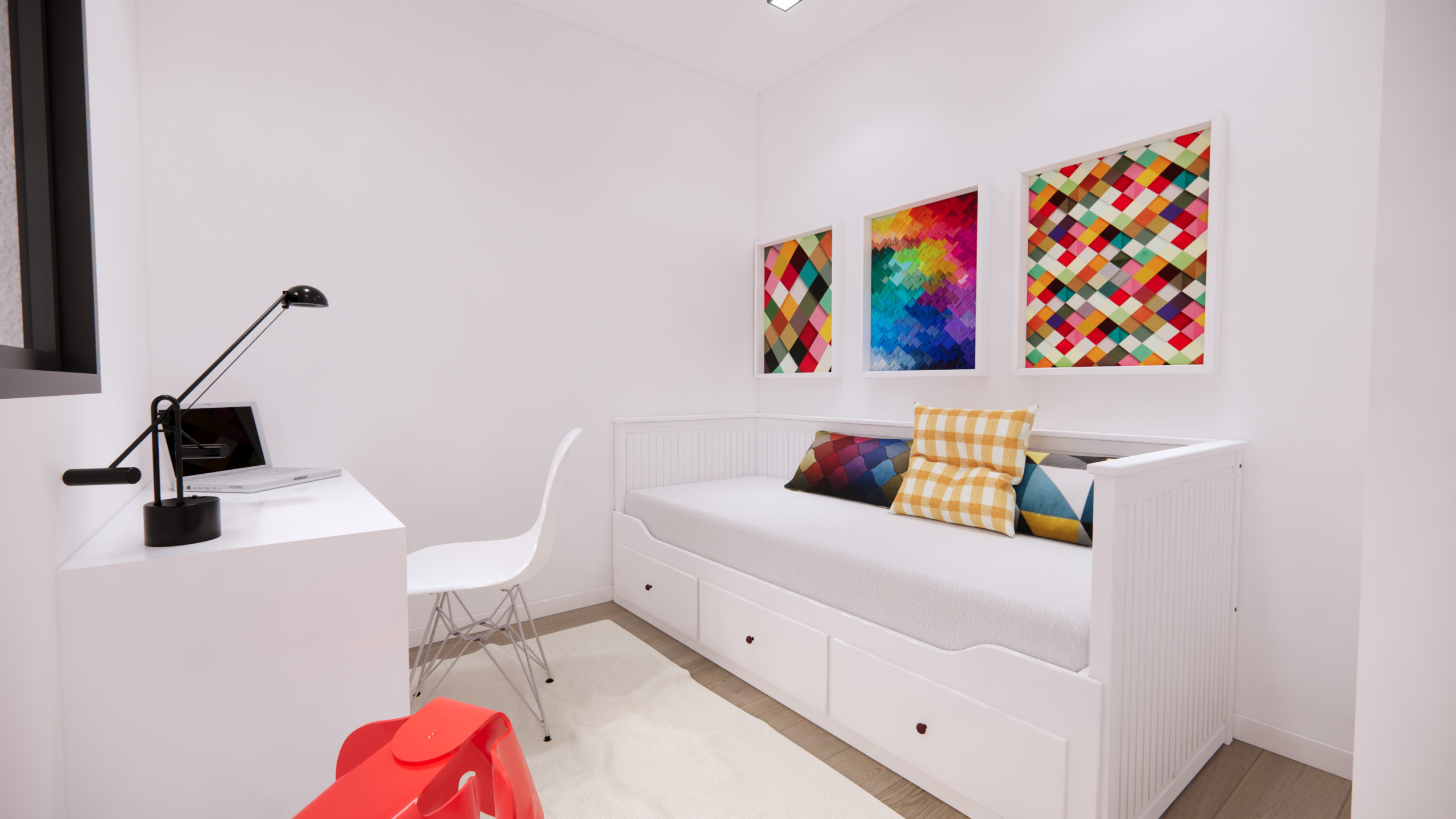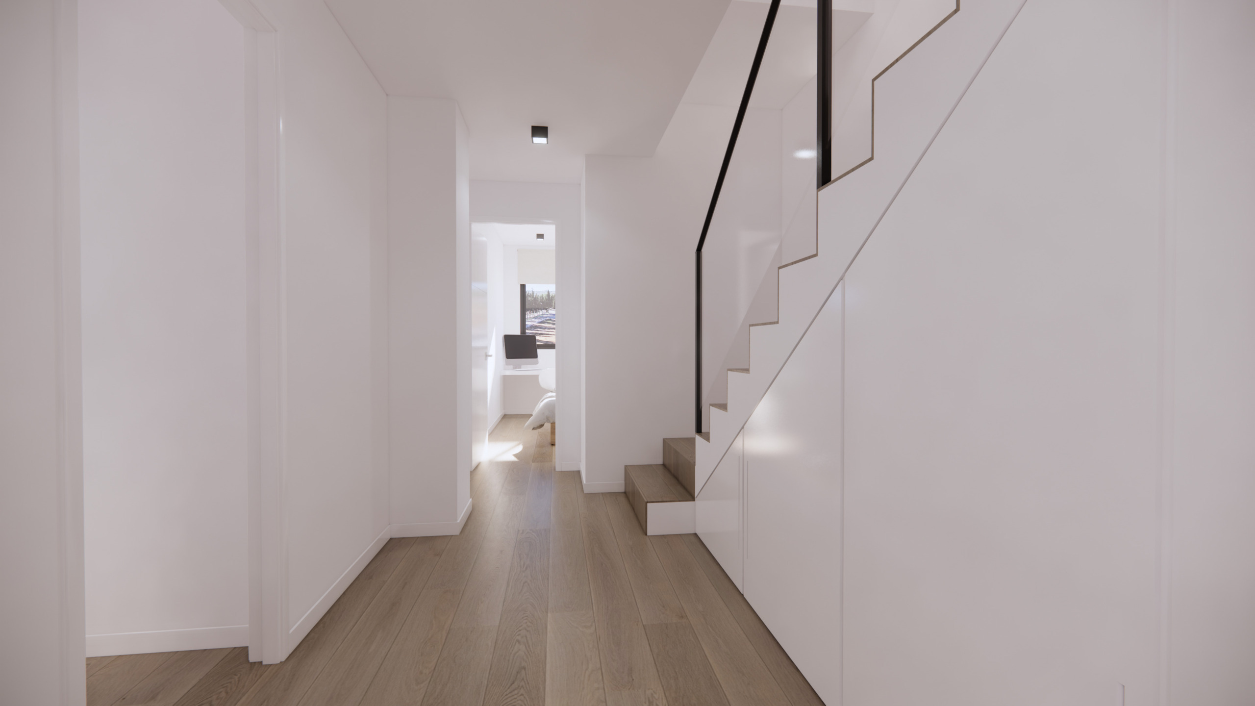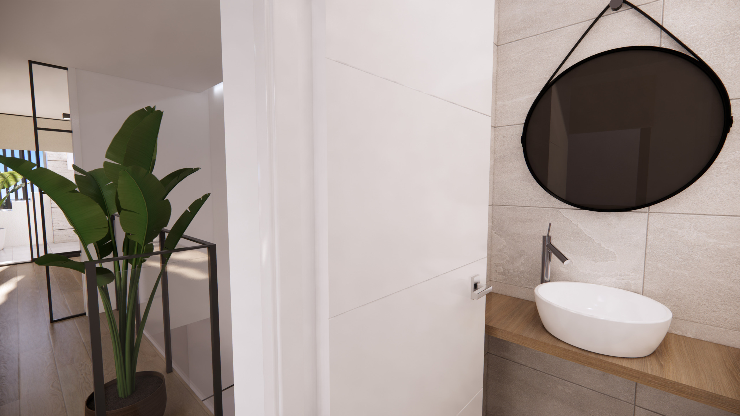 Die Schlafzimmer haben große Fenster, die viel Licht hereinlassen, und moderne, weiß lackierte Schränke. Die Bäder sind komplett mit Waschbecken, Schrank, Spiegel und Duschwand ausgestattet.