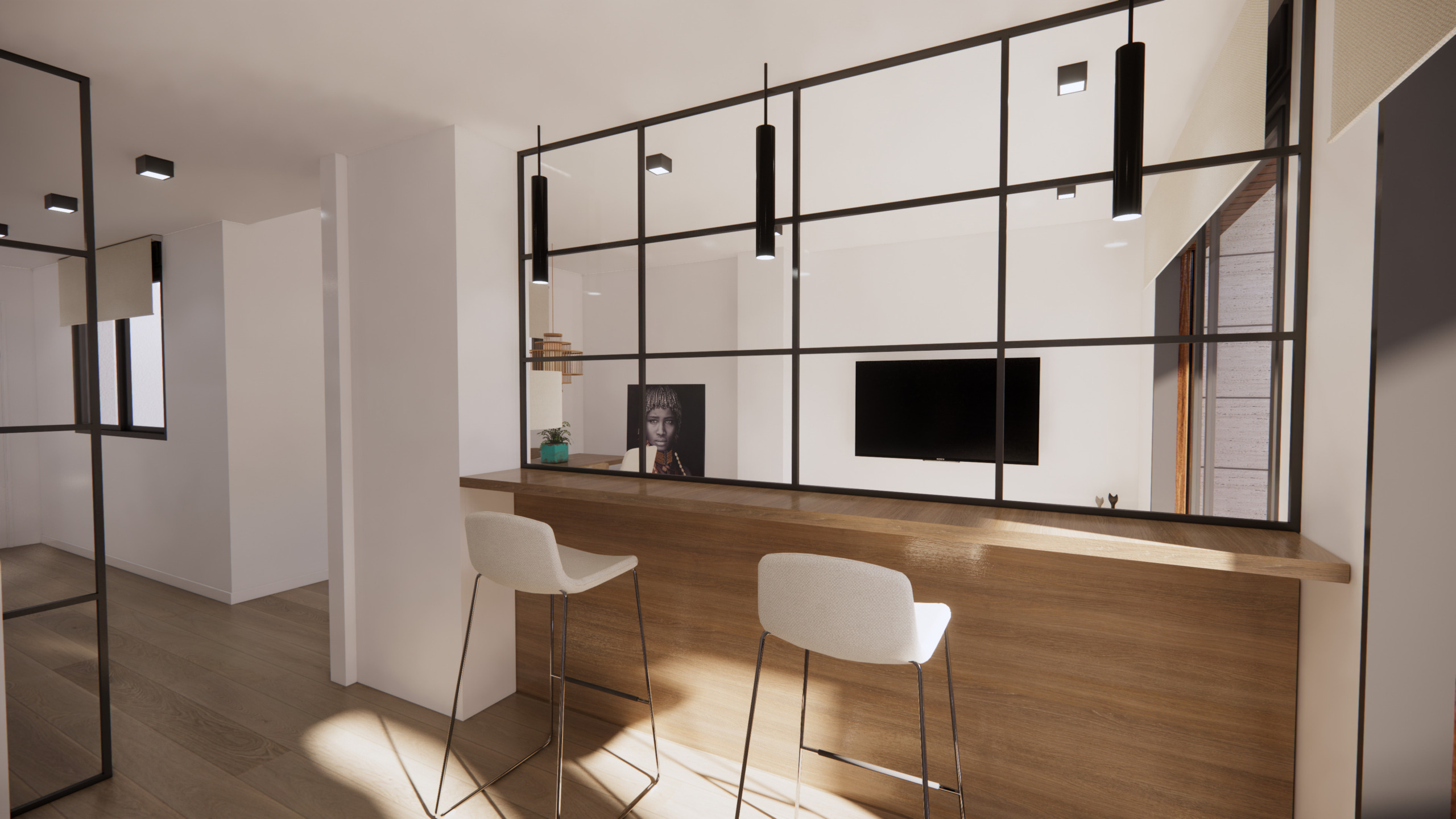 Es hat einen offenen Wohn- und Esszimmer mit viel Licht, eine voll ausgestattete Küche mit hohen und niedrigen Schränken und eingebautem Waschbecken.
