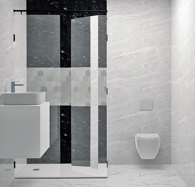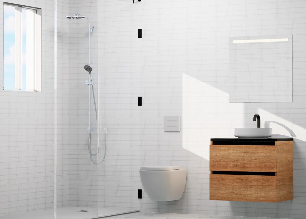 Die Bäder werden komplett mit Waschbecken, Schrank, Spiegel und Duschwand geliefert.