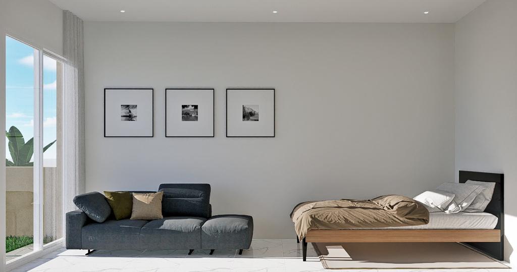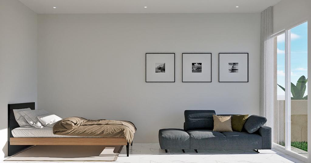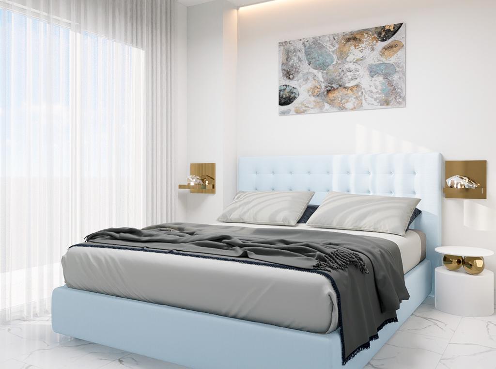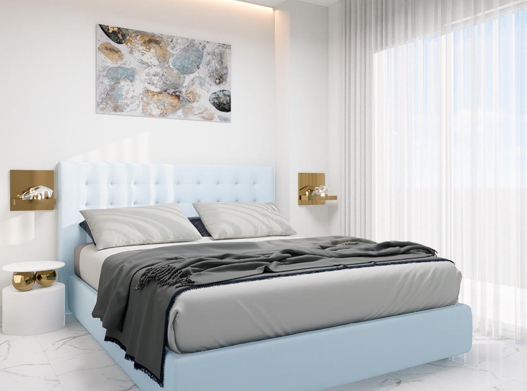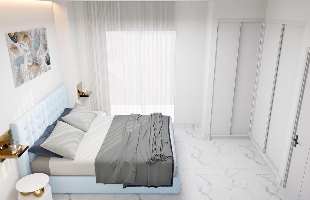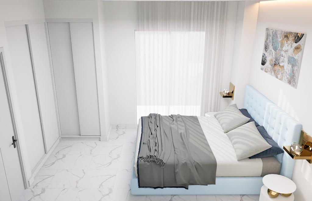 Die Schlafzimmer sind mit LED-Leuchten, Pendelleuchten, großen Fenstern, die für viel Licht sorgen, mit elektrischen Jalousien und modernen, weiß lackierten Einbauschränken ausgestattet.