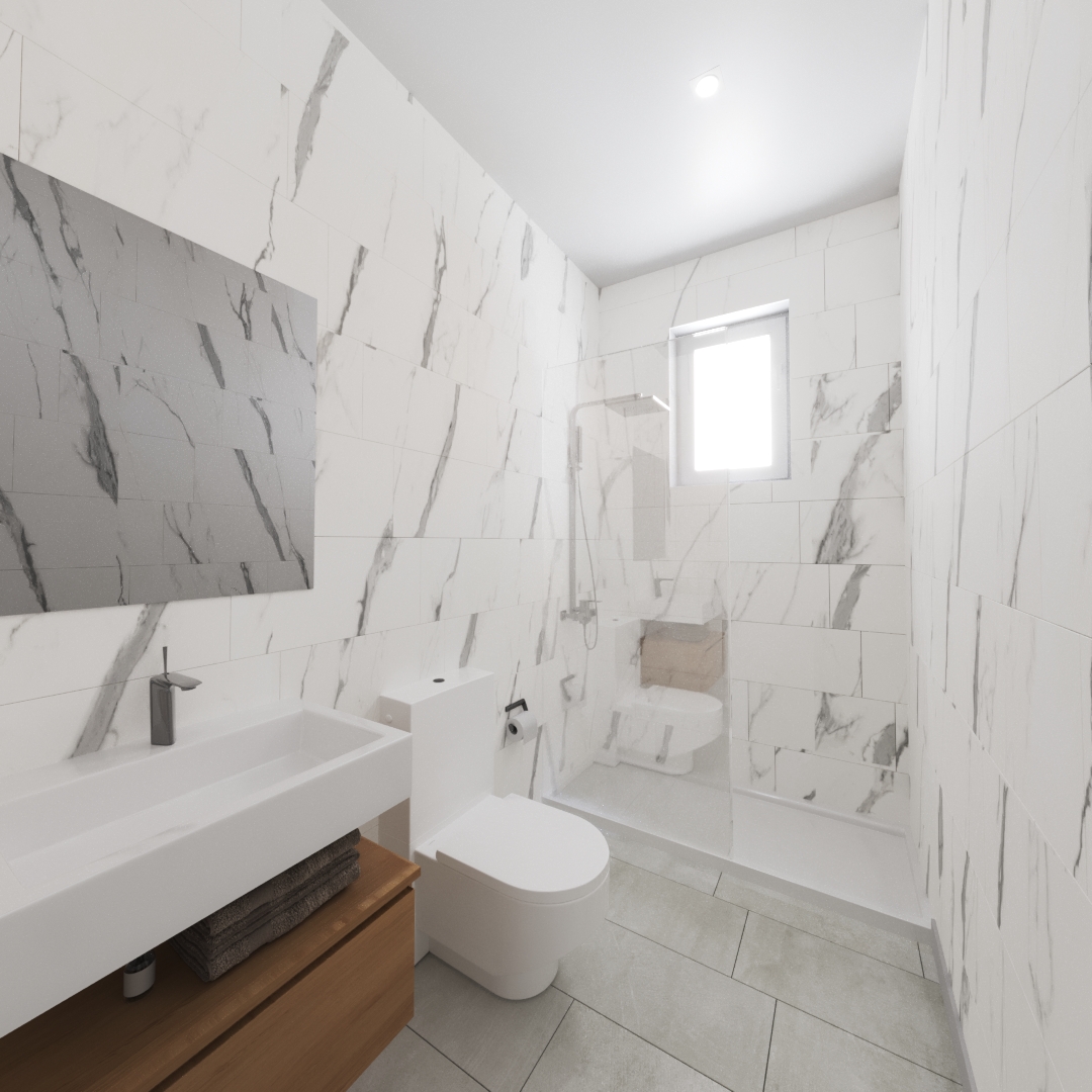 Die Bäder sind komplett mit Waschbecken, Schrank, Spiegel und Duschwand ausgestattet.