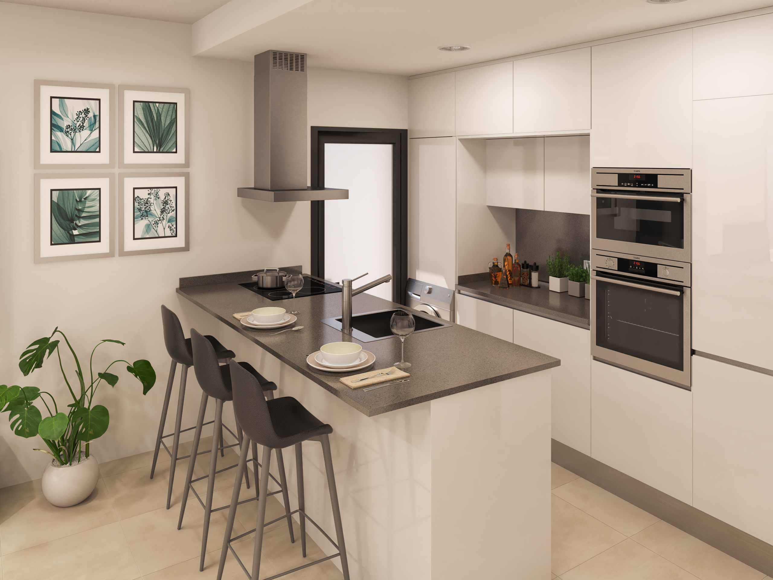 Die Wohnungen werden mit einer voll ausgestatteten Küche mit Ober- und Unterschränken und Geräten, Einbauschränken in den Schlafzimmern und Bädern mit Möbeln, Spiegel und Duschwand geliefert. Außerdem ist eine Klimaanlage vorinstalliert.