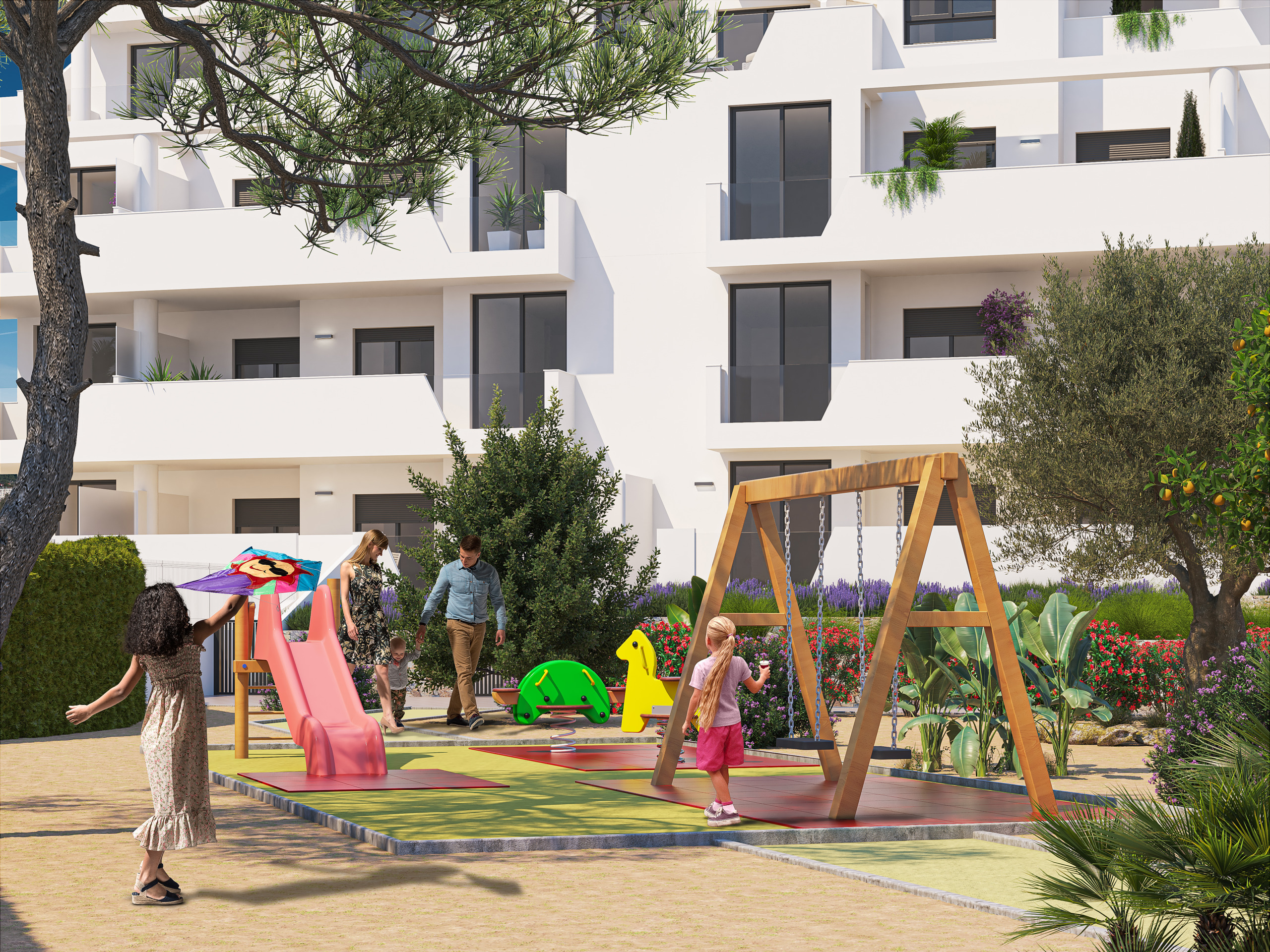 Moderne Wohnungen mit 2 Schlafzimmern und 2 Bädern. Alle Wohnungen haben Terrassen, und zusätzlich haben die Häuser im Erdgeschoss einen Garten und die im Obergeschoss haben eine Sonnenterrasse mit Sommerküche.