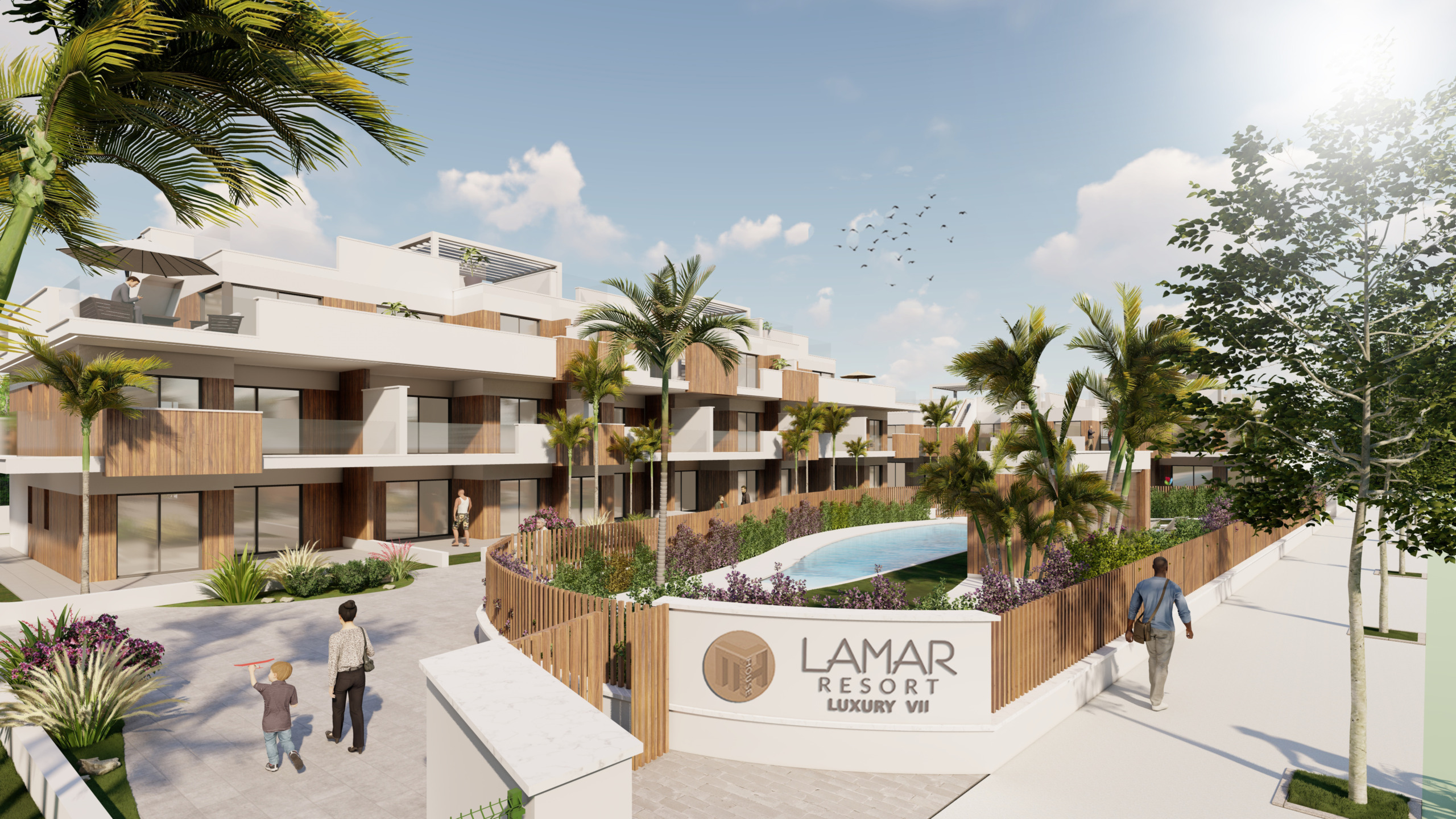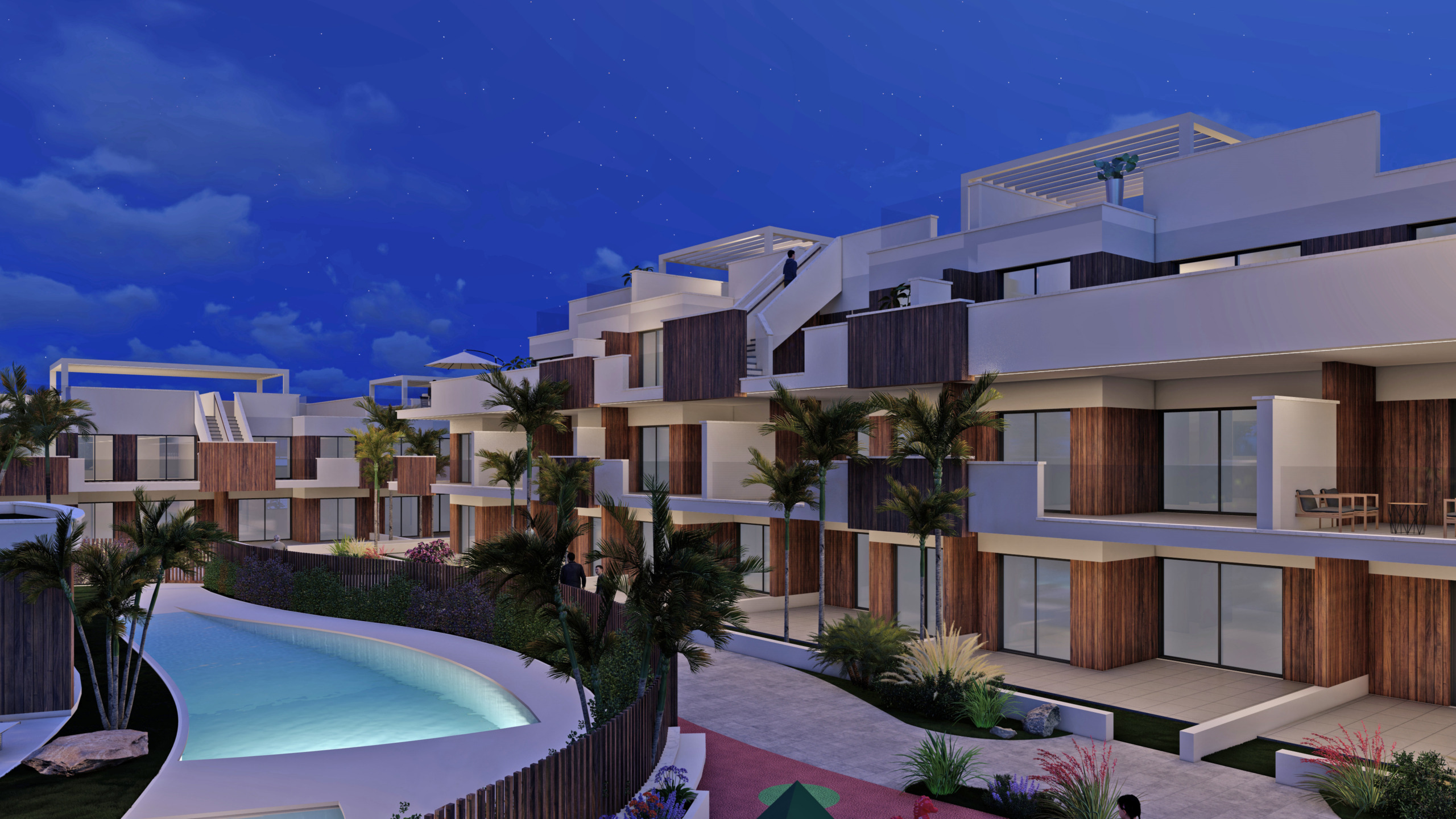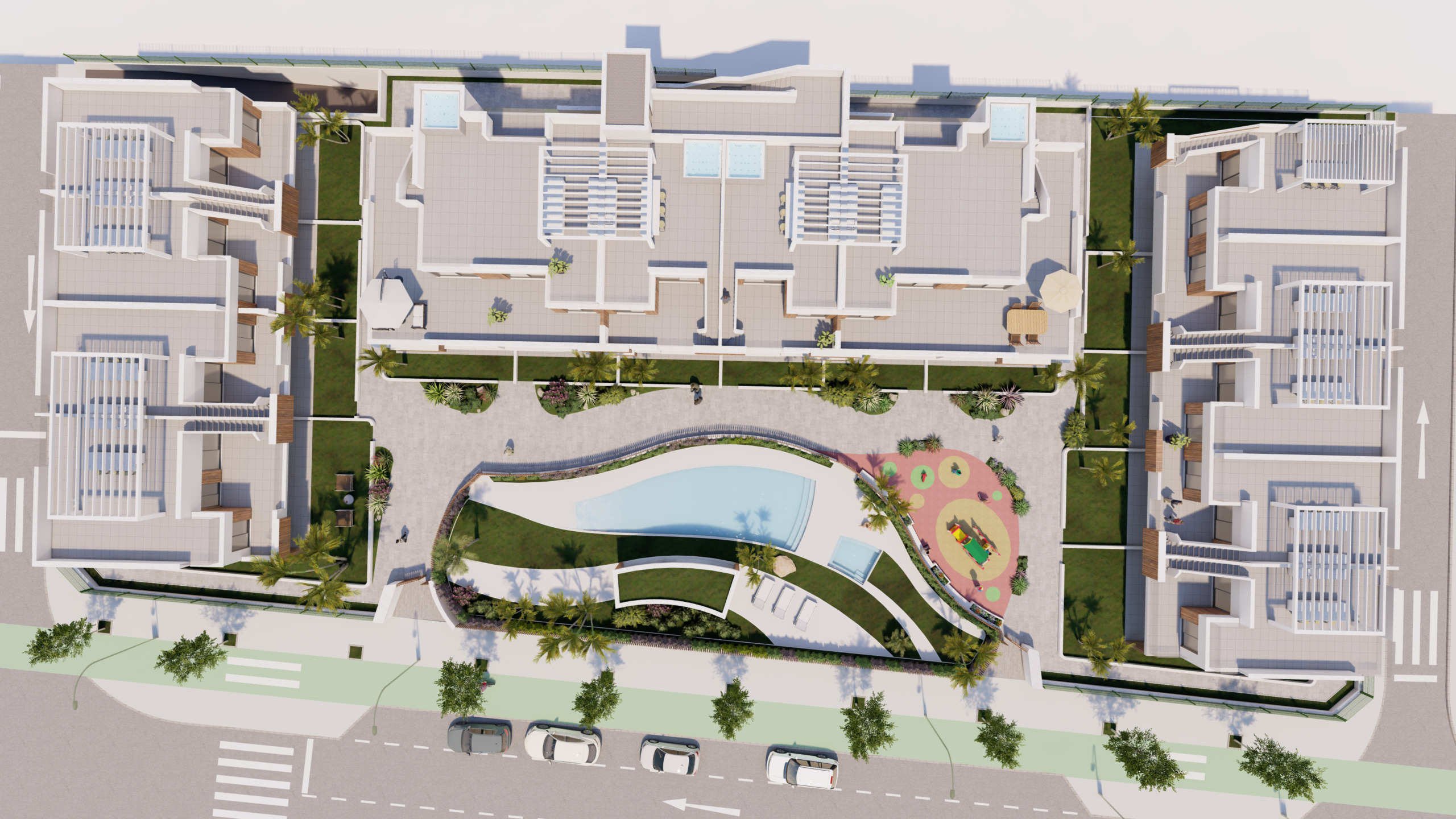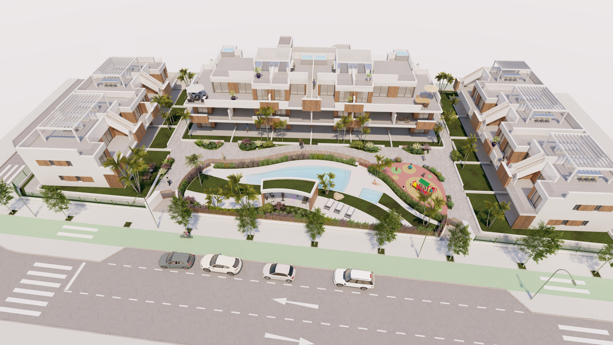 -Wohnungen im Erdgeschoss mit Garten, im ersten Stock mit einer großen Terrasse und private Penthäuser mit einem Solarium mit 2-3 Schlafzimmern und 2 Bädern. Die Penthäuser verfügen über Kunstrasen und Jacuzzi-Installation.