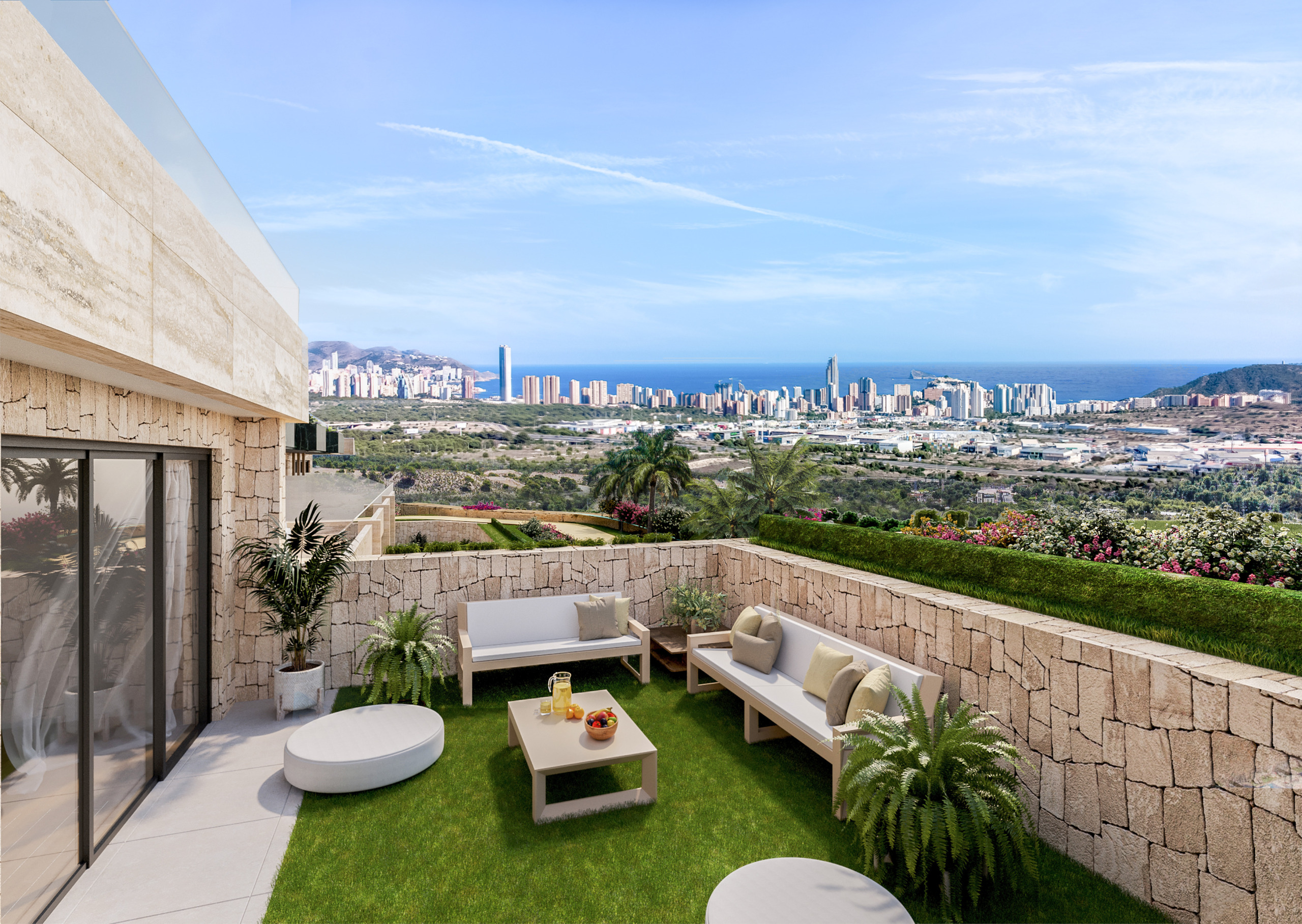 Duplex mit Garten in einer privaten Wohngegend mit privilegiertem Blick auf das Meer und die Skyline von Benidorm.