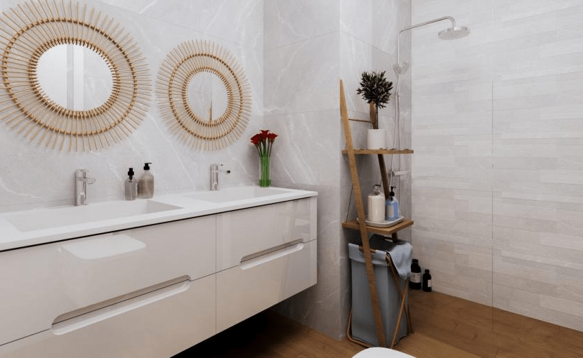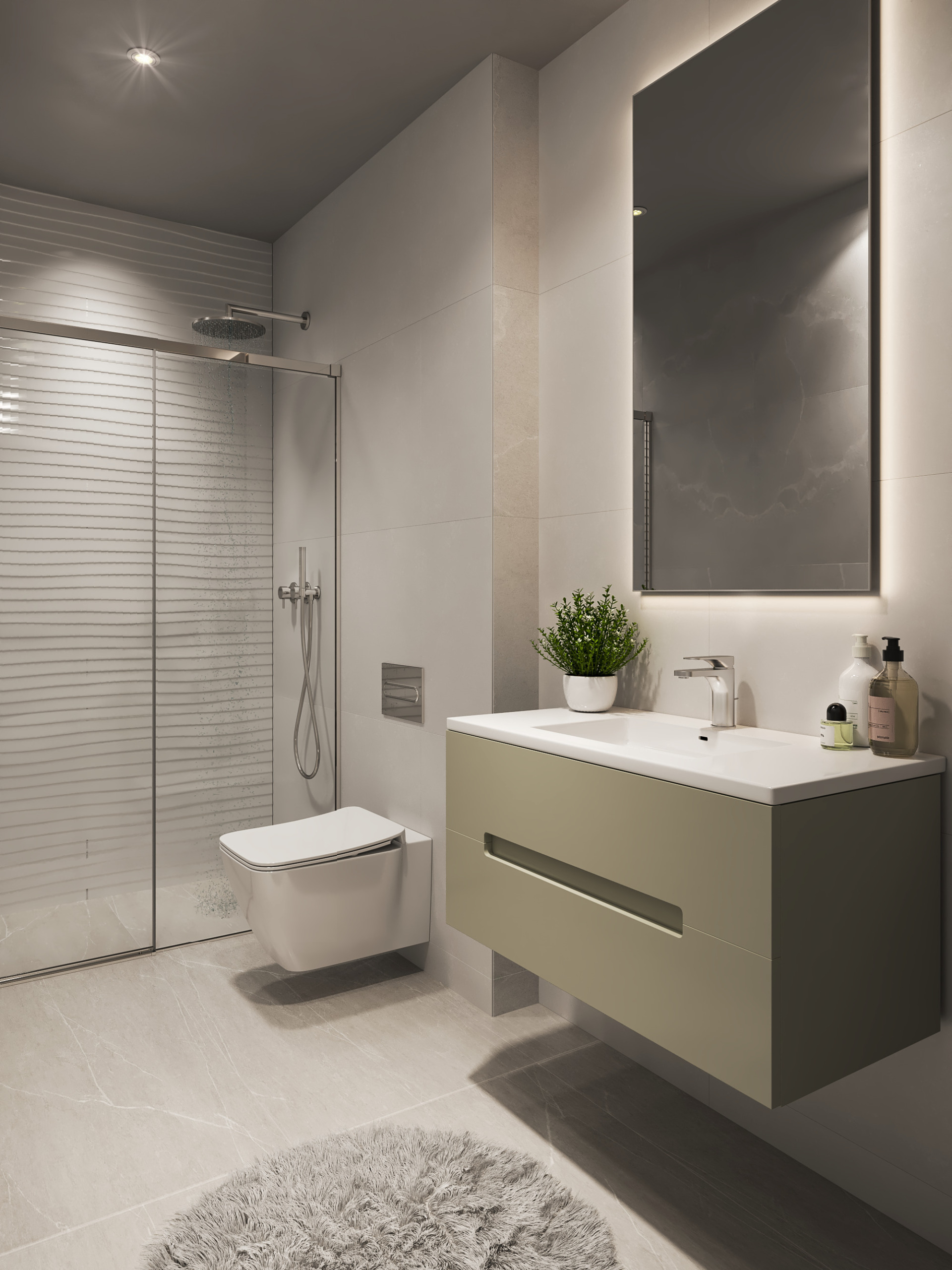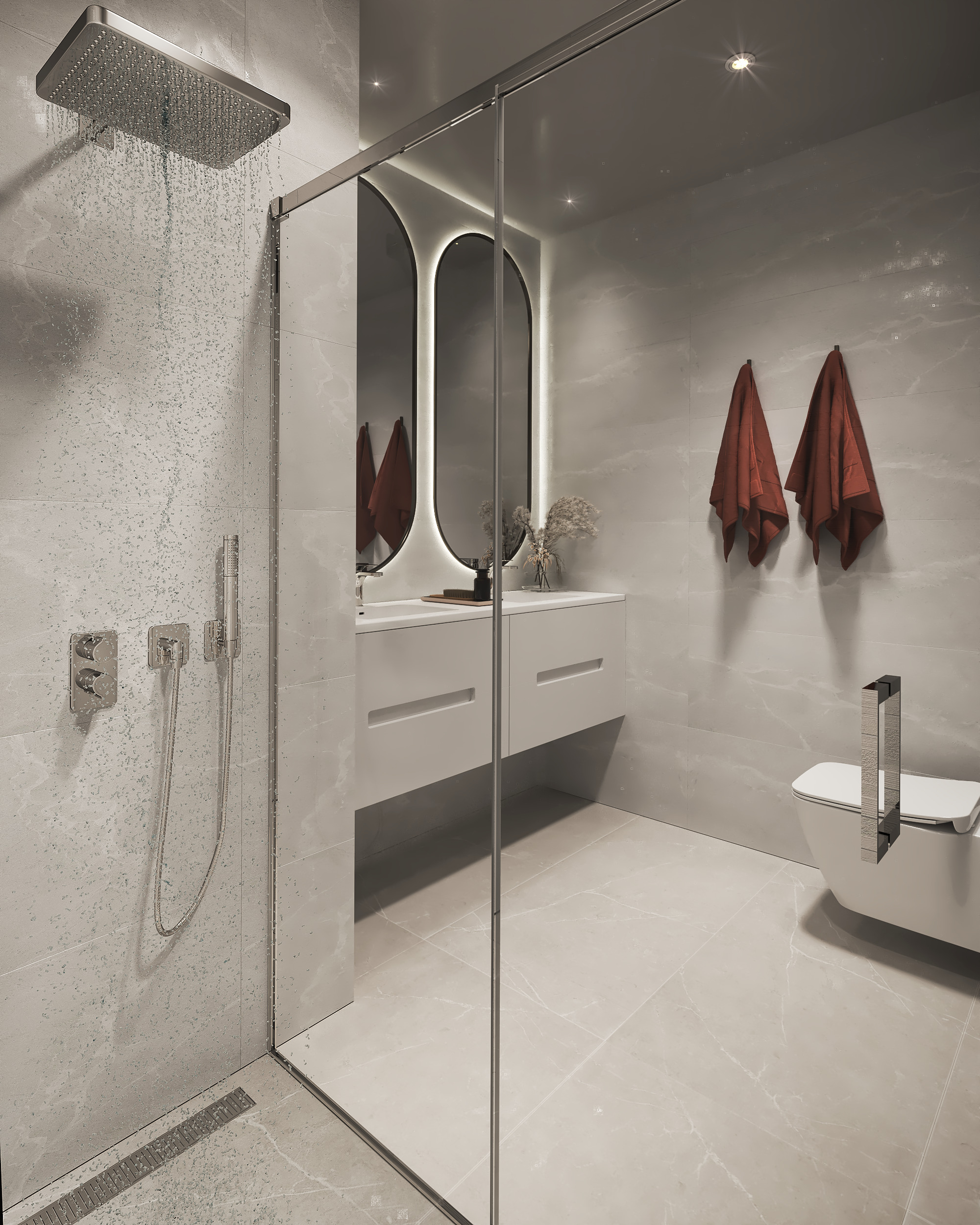 Es verfügt über zwei große Schlafzimmer mit Einbauschränken und zwei Badezimmer mit Möbeln, einem hängenden Waschbecken, einer Toilette und Duschkabinen mit rutschfester Oberfläche auf dem Boden ausgestattet.