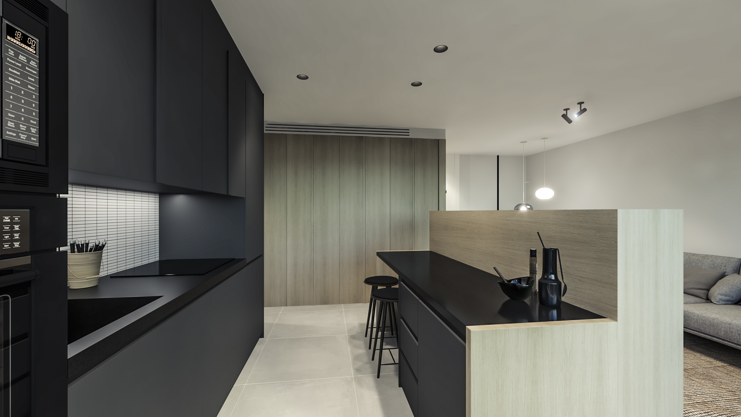 Funktionelle Küchen im modernen Stil mit geraden Linien, langlebigen Materialien und kompakten Quarz-Arbeitsplatten und Einhebelarmaturen. Darüber hinaus sind sie für den totalen Komfort komplett ausgestattet mit integrierter Dunstabzugshaube, Elektroherd, Mikrowelle, Induktionskochfeld, Waschmaschine, Geschirrspüler und Kühlschrank.