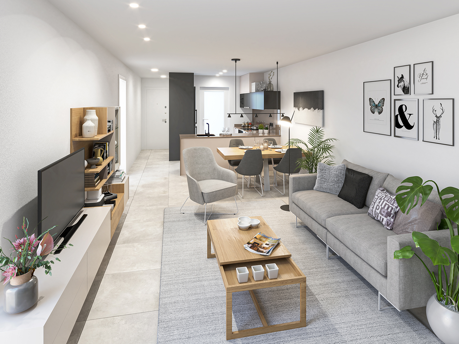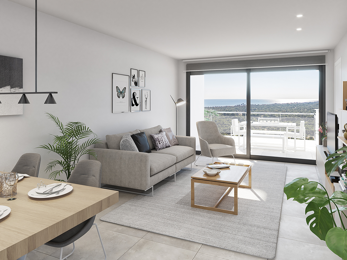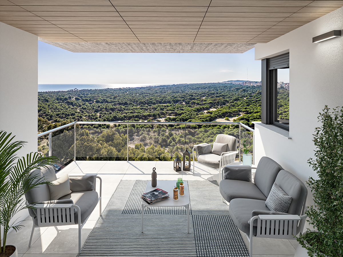 Es ist auf einer Etage mit 2 oder 3 Schlafzimmer und 2 Bäder, Balkon, Gemeinschaftspool, Parkplatz und Abstellraum verteilt.