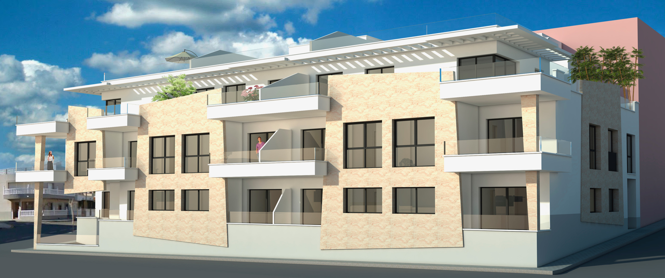 Die Promotion hat nur 3 exklusive Wohnungen: 5 Wohnungen im Erdgeschoss, 5 Wohnungen in der ersten Etage und 3 exklusive Penthäuser mit privatem Solarium. Alle Häuser haben eine Terrasse, einen Tiefgaragenstellplatz und einige der Wohnungen haben auch einen Abstellraum.