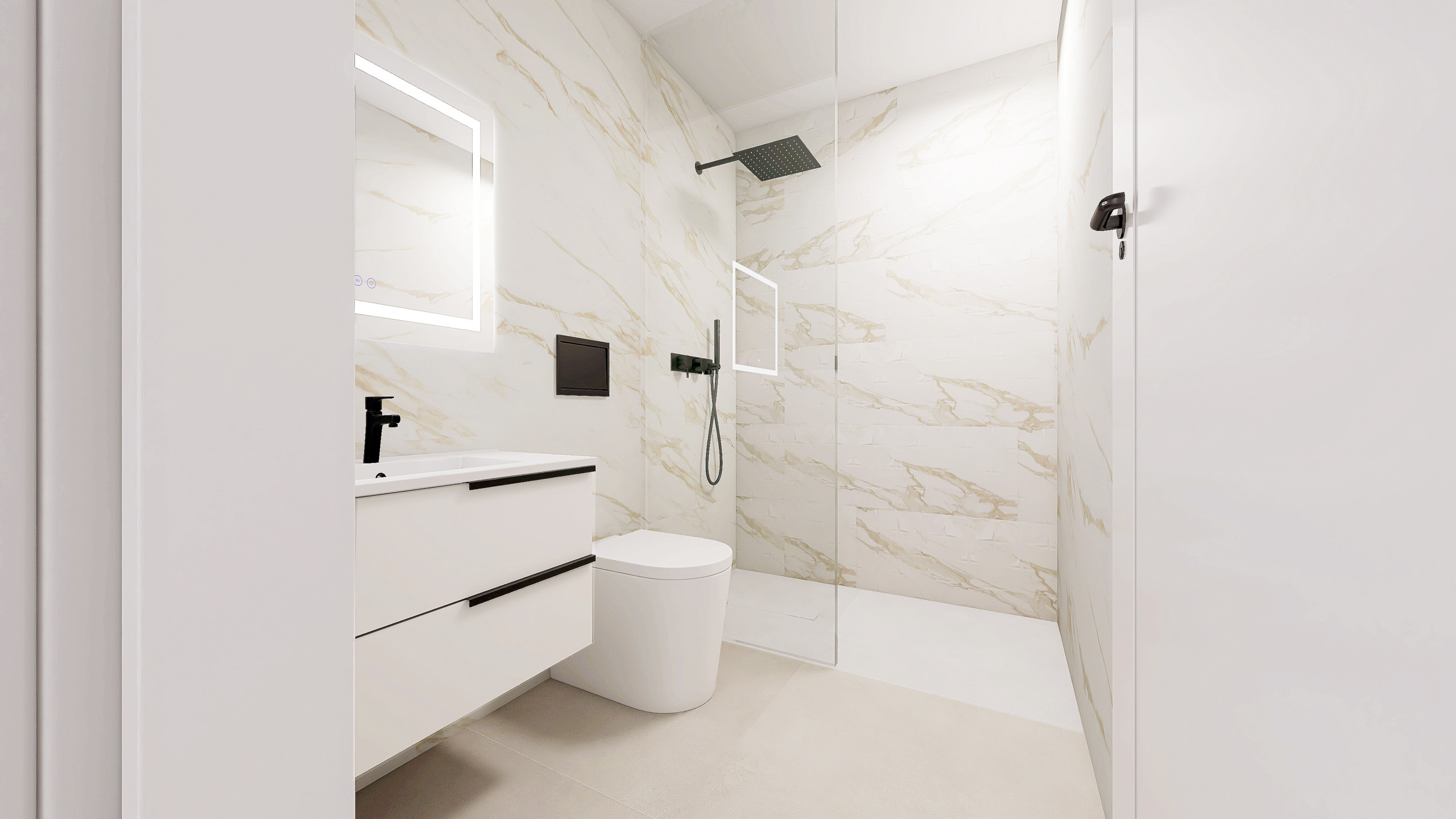 – Vollständige Badezimmer mit Möbeln und Duschwand