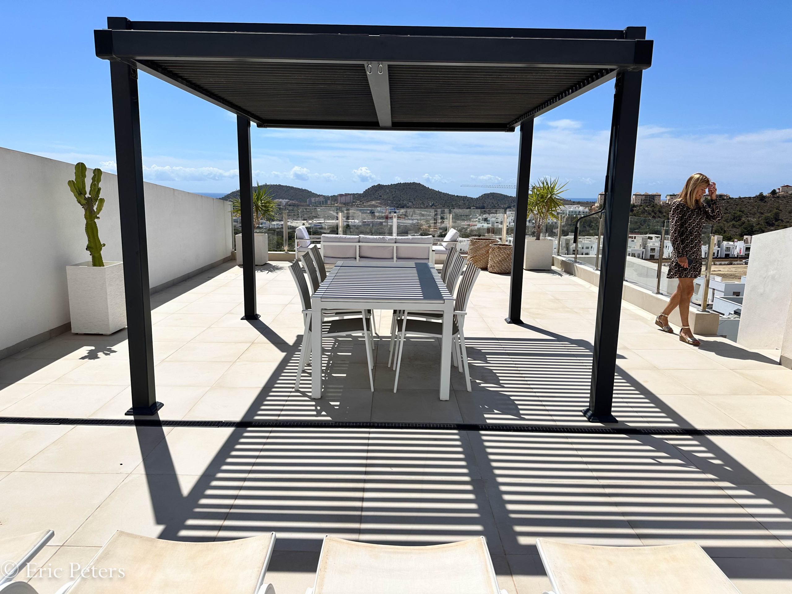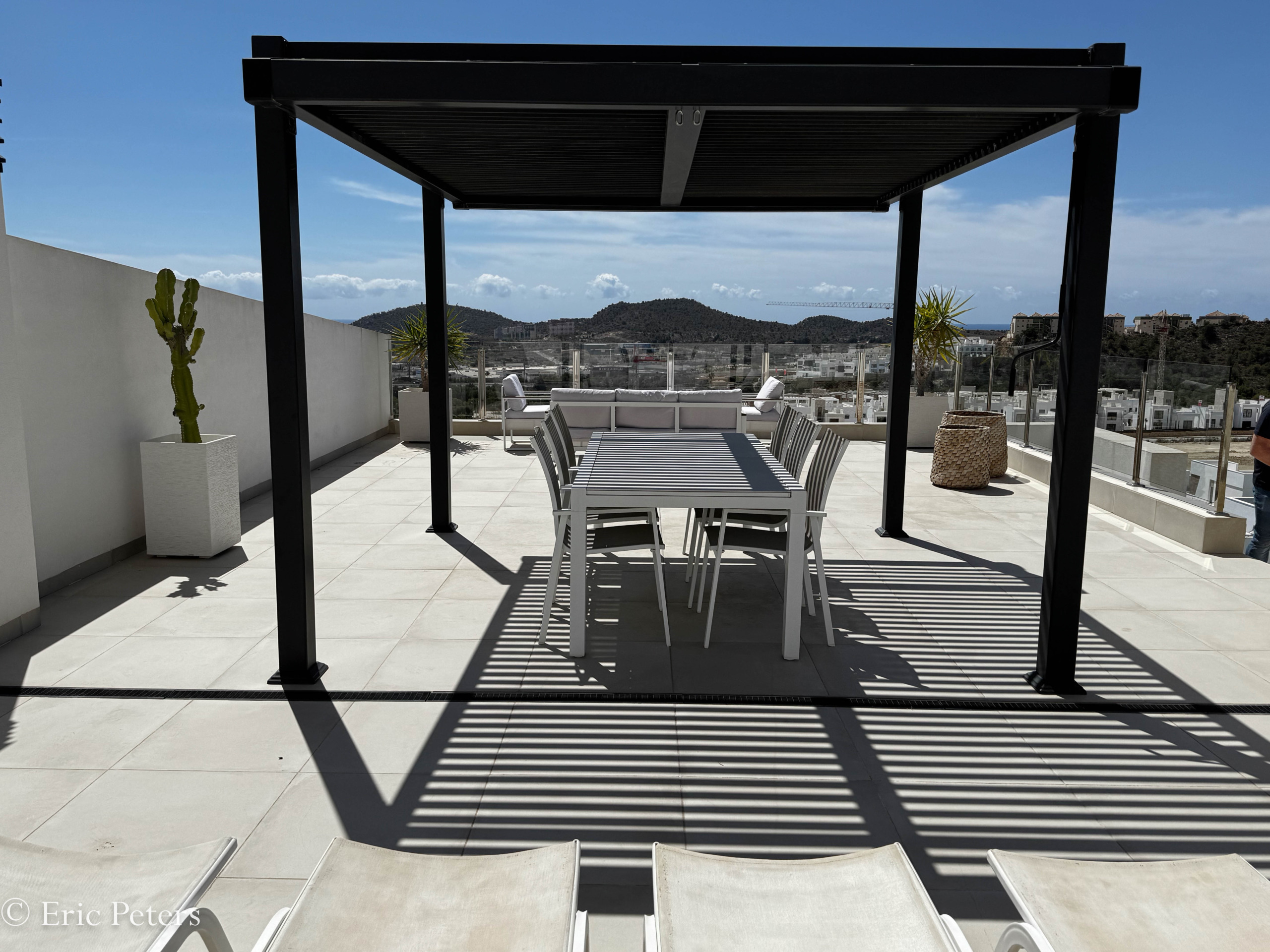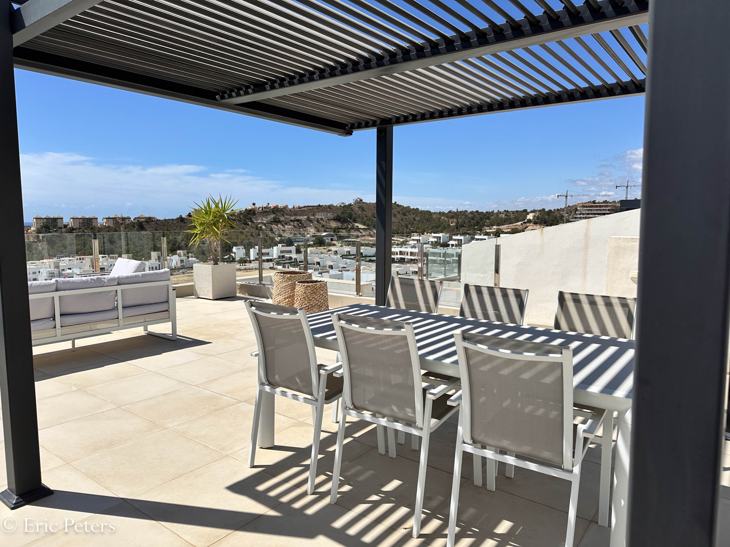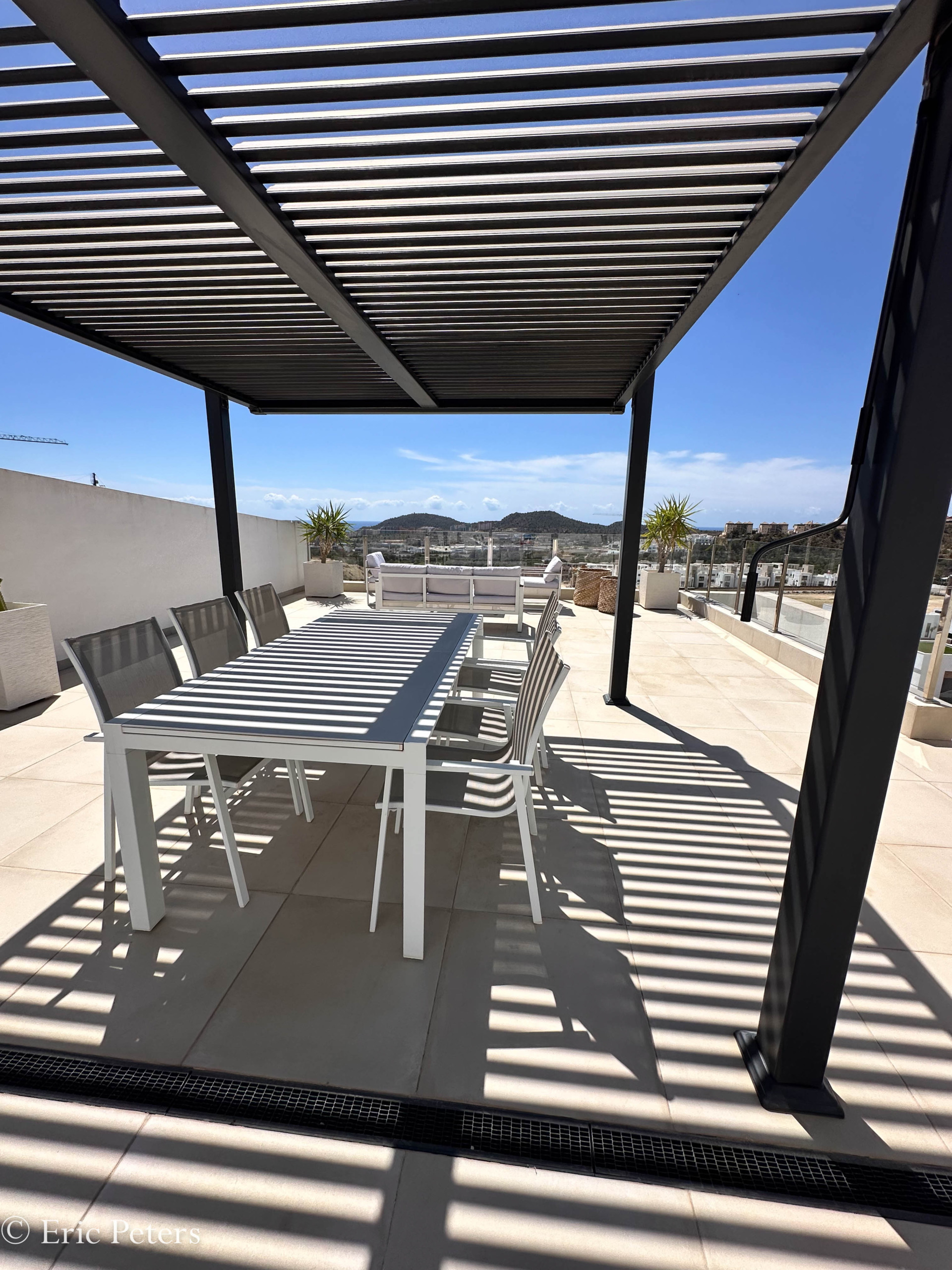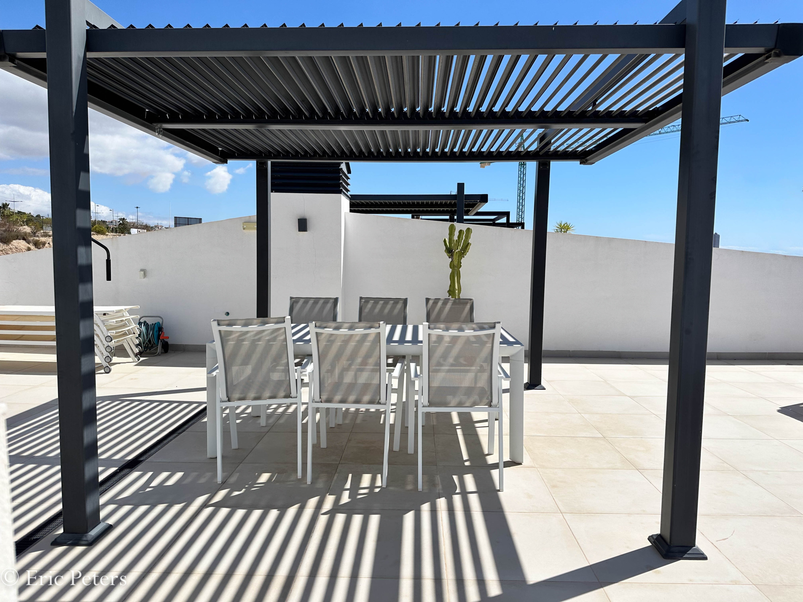 Das Solarium hat eine Pergola installiert und Outdoor-Möbel.