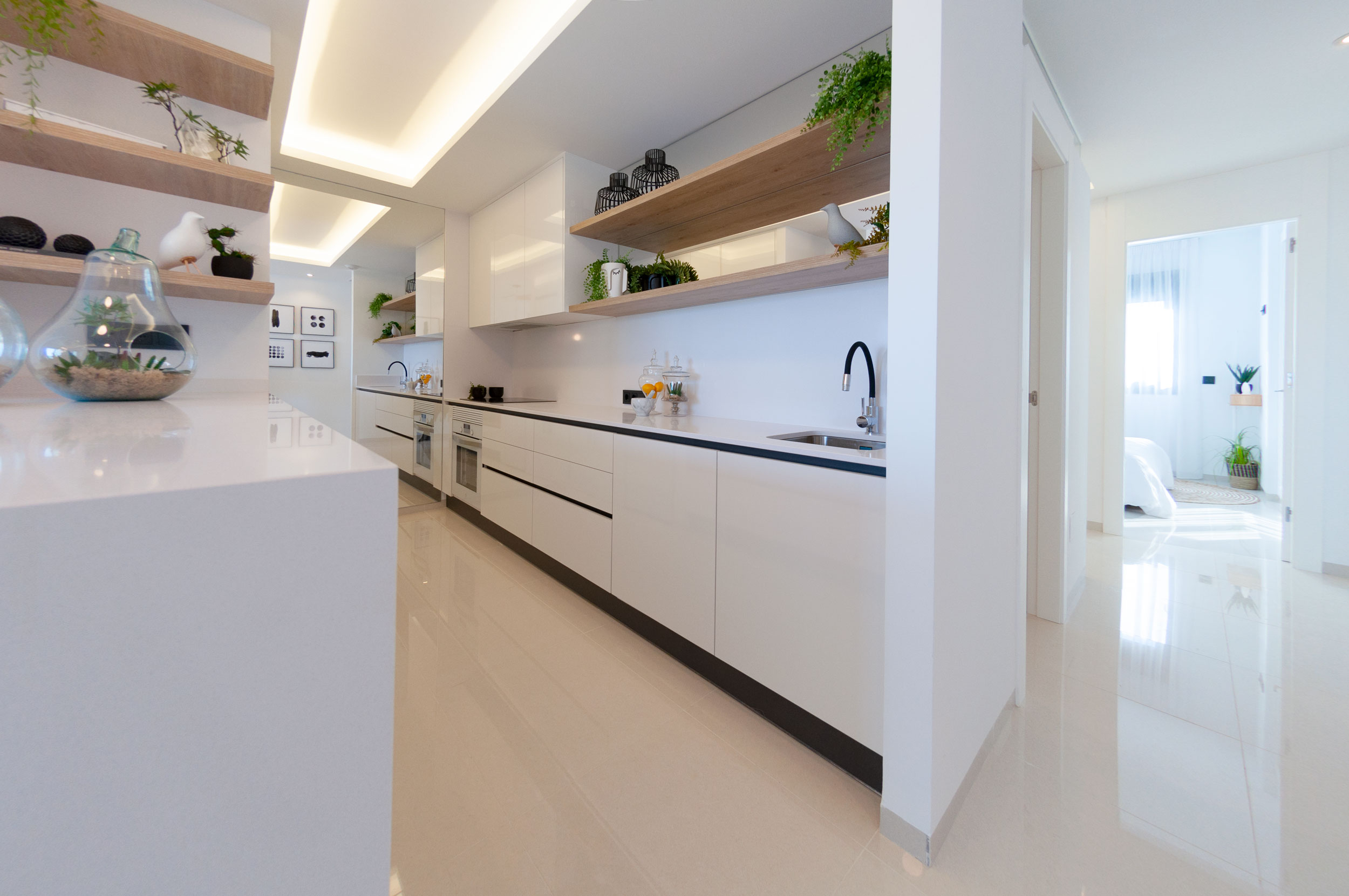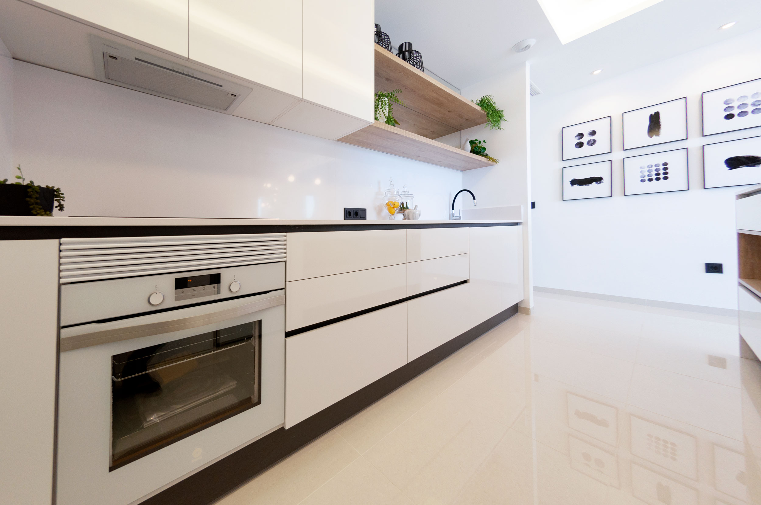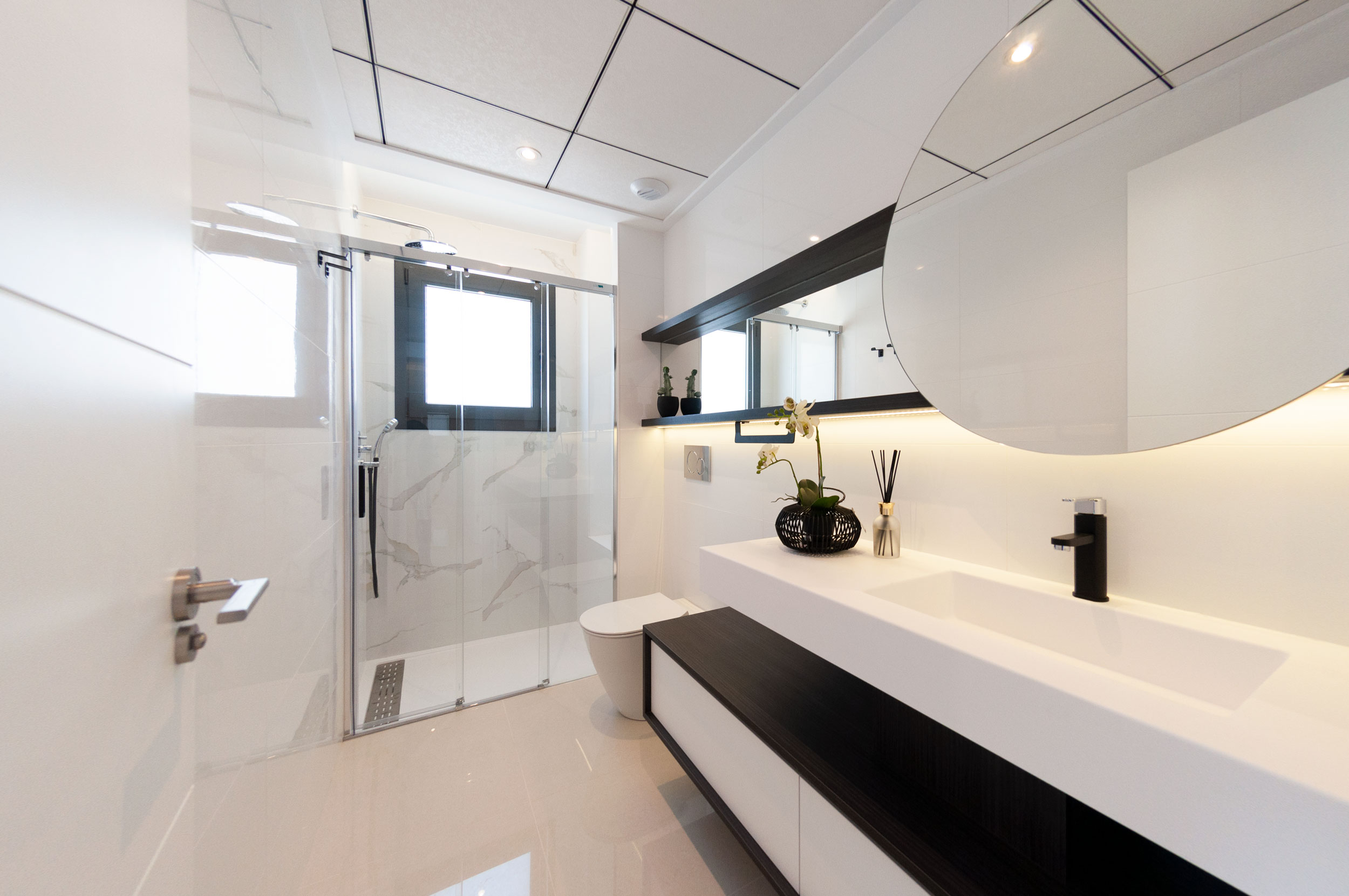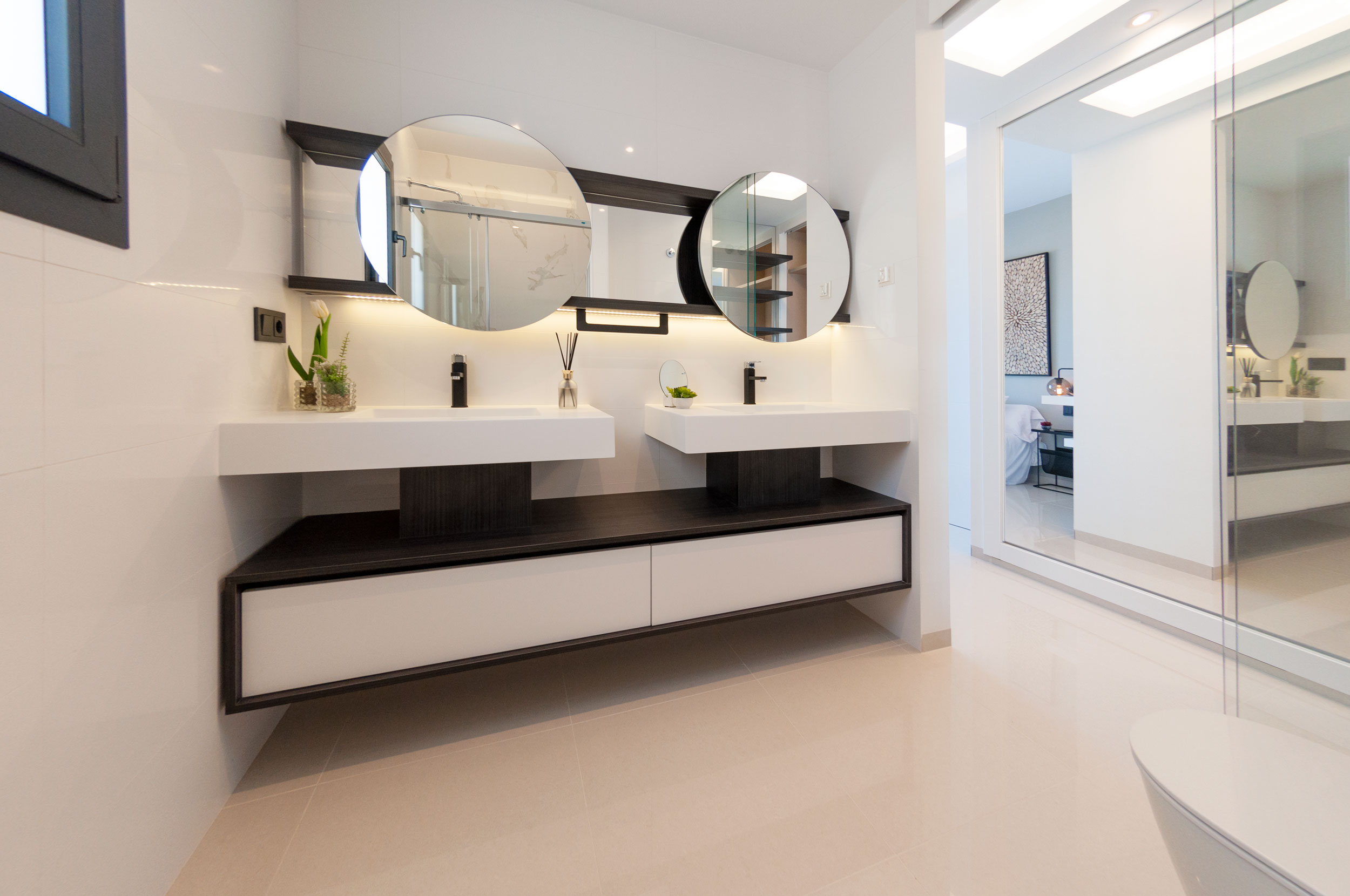 Die Häuser werden mit den höchsten Qualitäten geliefert: Die Küche hat eine Edelstahlspüle, eine Silestone-Arbeitsplatte, einen integrierten Dunstabzug und schwarze Armaturen. Die Bäder sind mit Fußbodenheizung, kompletten Möbeln und schwarzen Armaturen ausgestattet. Die Einbauschränke in den Zimmern sind mit Textilholz verkleidet und verfügen über Spiegel sowie eine Vorinstallation für LED-Beleuchtung. Das Haus hat eine Vorinstallation für eine Klimaanlage.