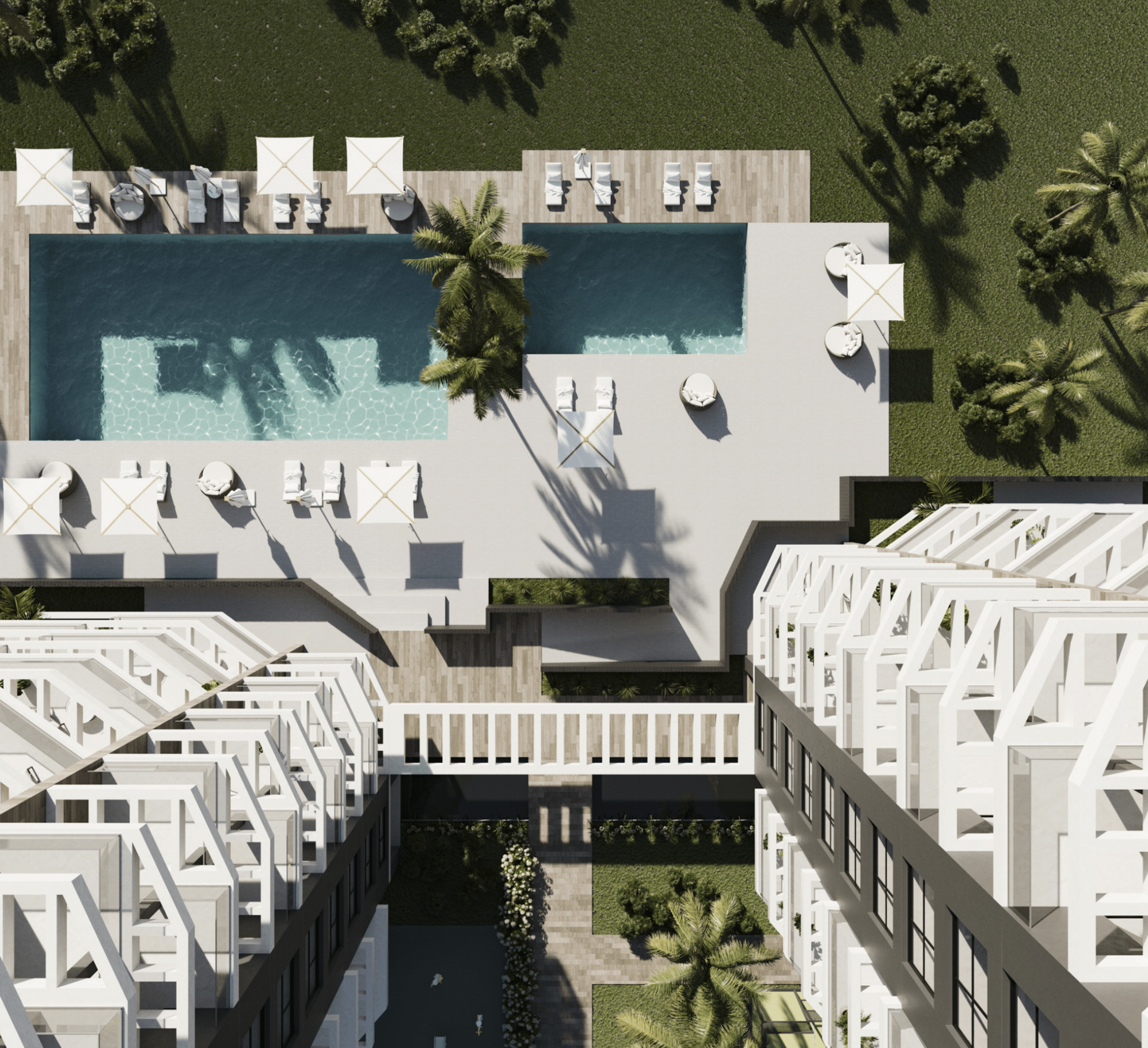 In den Gemeinschaftsbereichen gibt es zwei Swimmingpools (einer davon mit Strandzugang), einen Bereich mit Sonnenliegen und Kunstrasen, einen Kinderspielplatz, einen Paddle-Tennisplatz, einen Fahrradabstellplatz und Gartenbereiche. Die Wohnungen verfügen über einen Parkplatz mit einer Vorinstallation zum Aufladen von Elektroautos.
