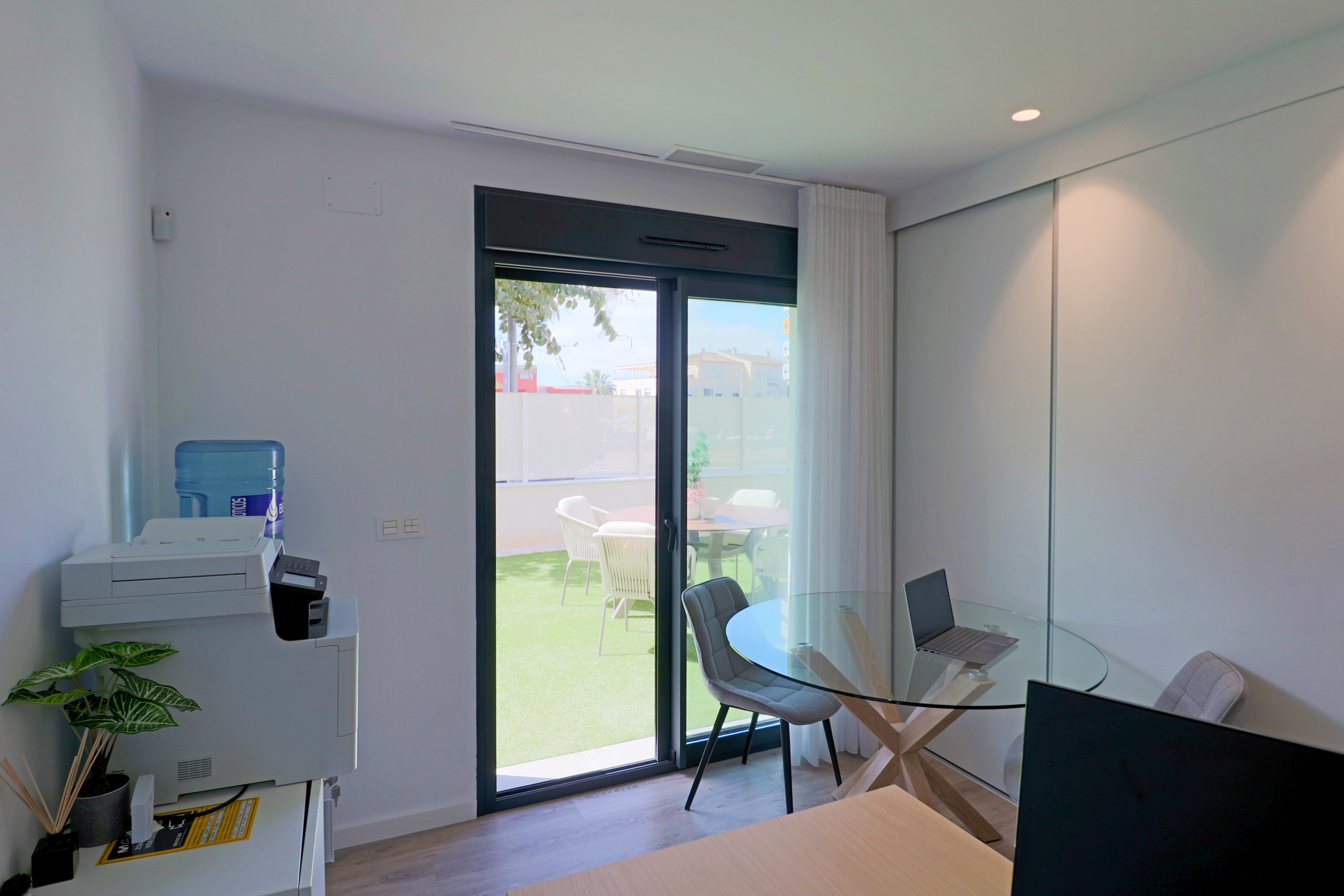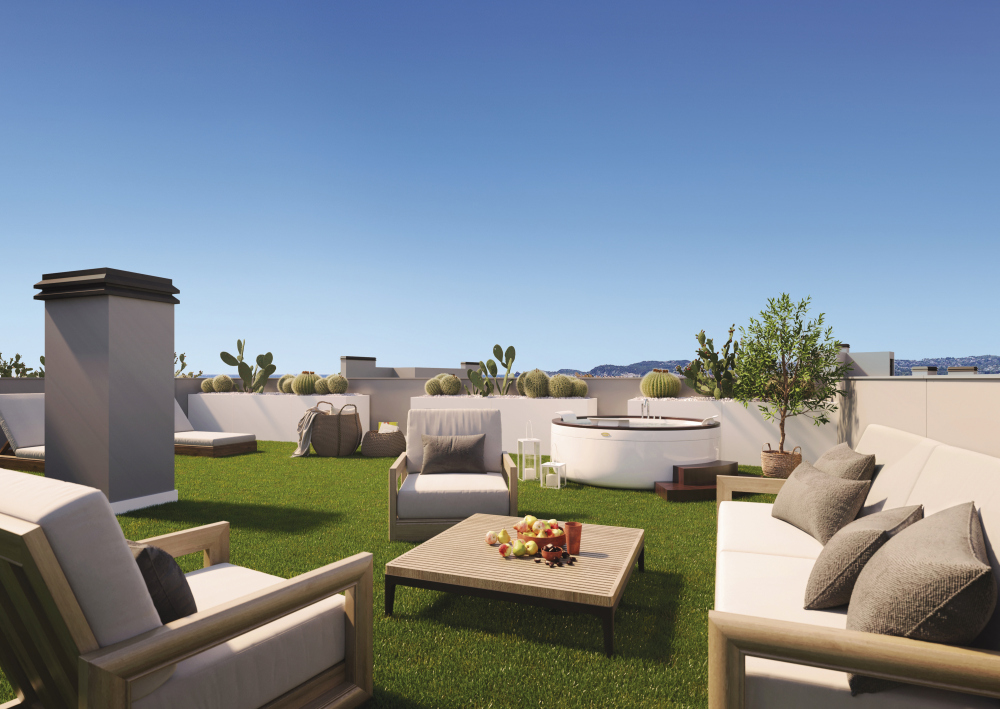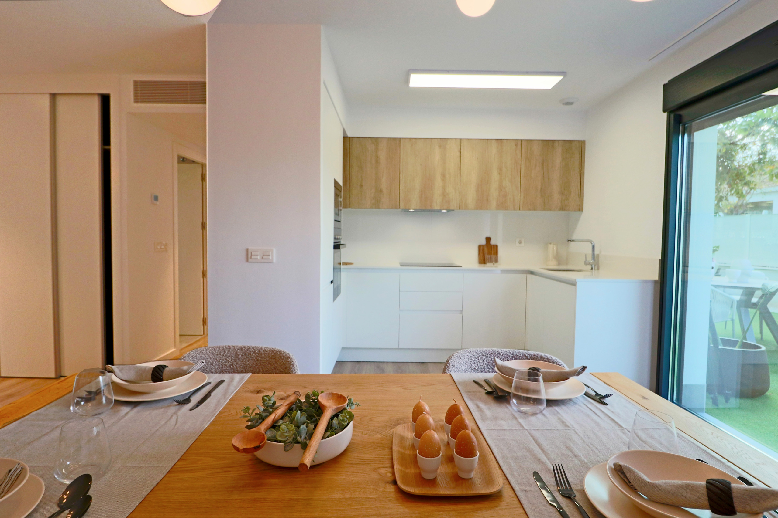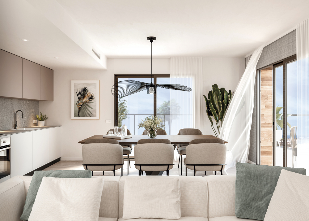 Wunderschöne Terrassen mit Meerblick, die mit dem Wohnzimmer verbunden sind. Zu jedem Haus gehört ein Tiefgaragenstellplatz mit einer Steckdose zum Aufladen von Elektrofahrzeugen.