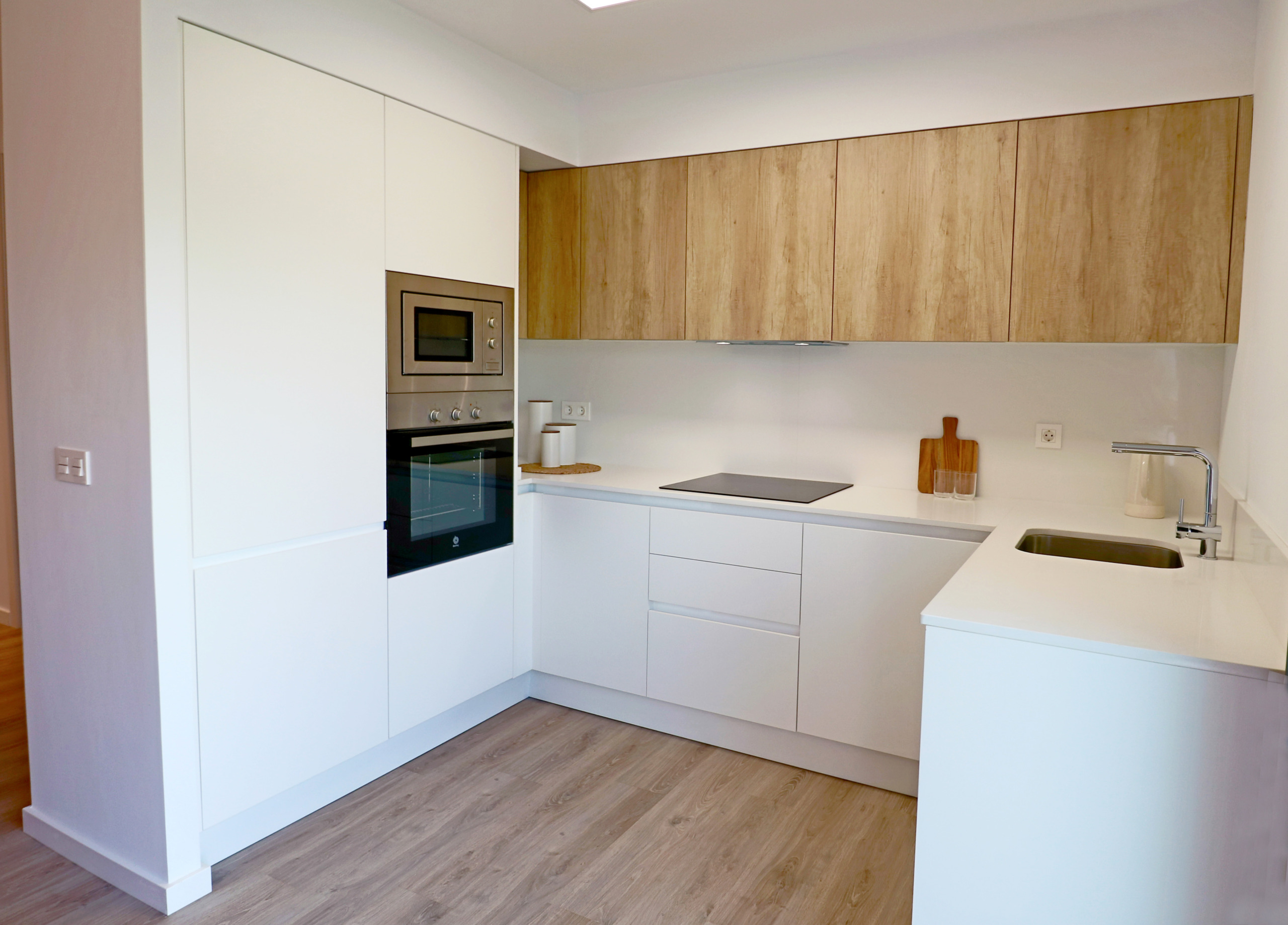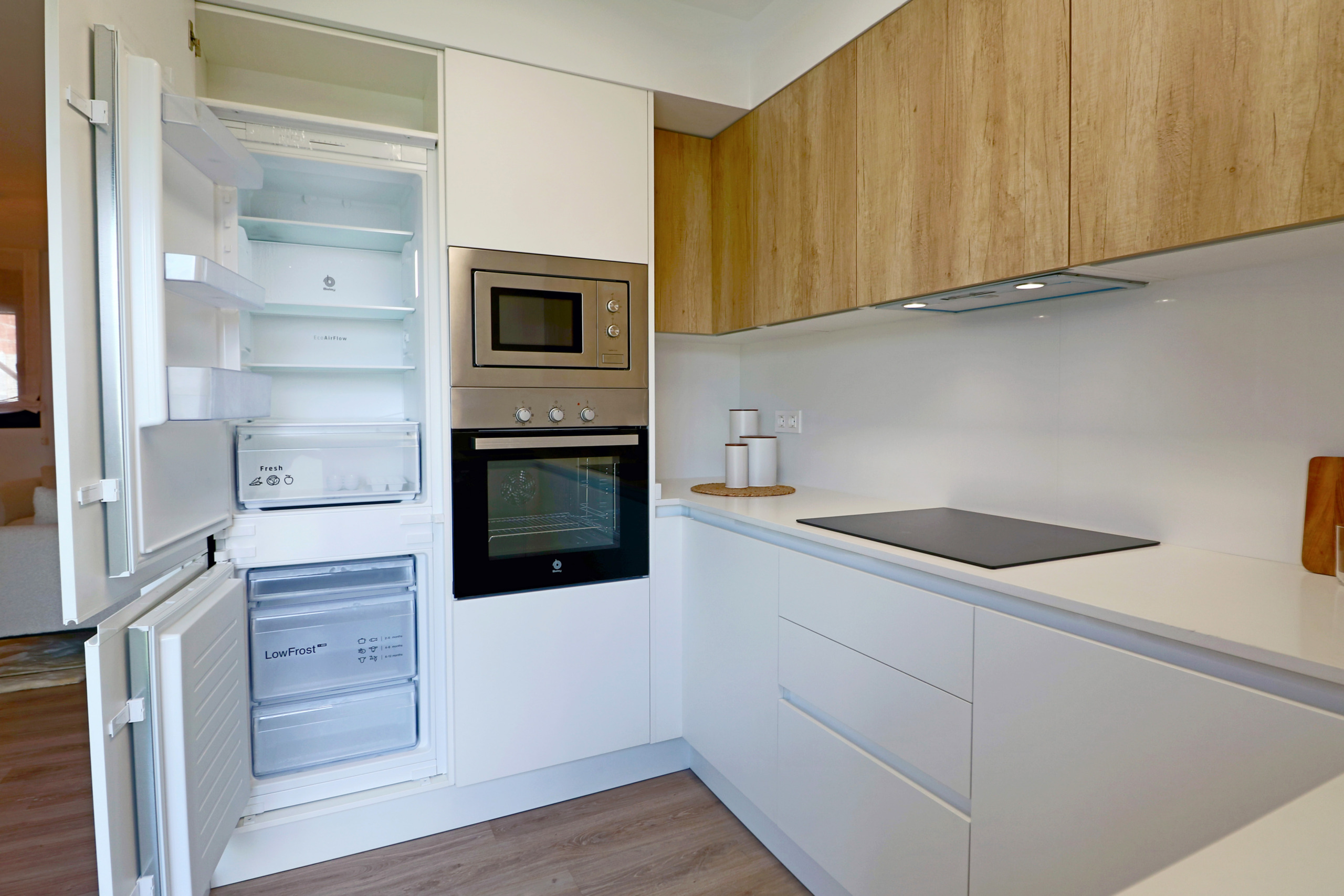 Ein geräumiges, helles Wohnzimmer mit großen Fenstern, verbunden mit einem Essbereich und einer offenen Küche. Voll ausgestattete Küche mit Haushaltsgeräten, Backofen, Mikrowelle, Induktionskochfeld und Dunstabzugshaube.