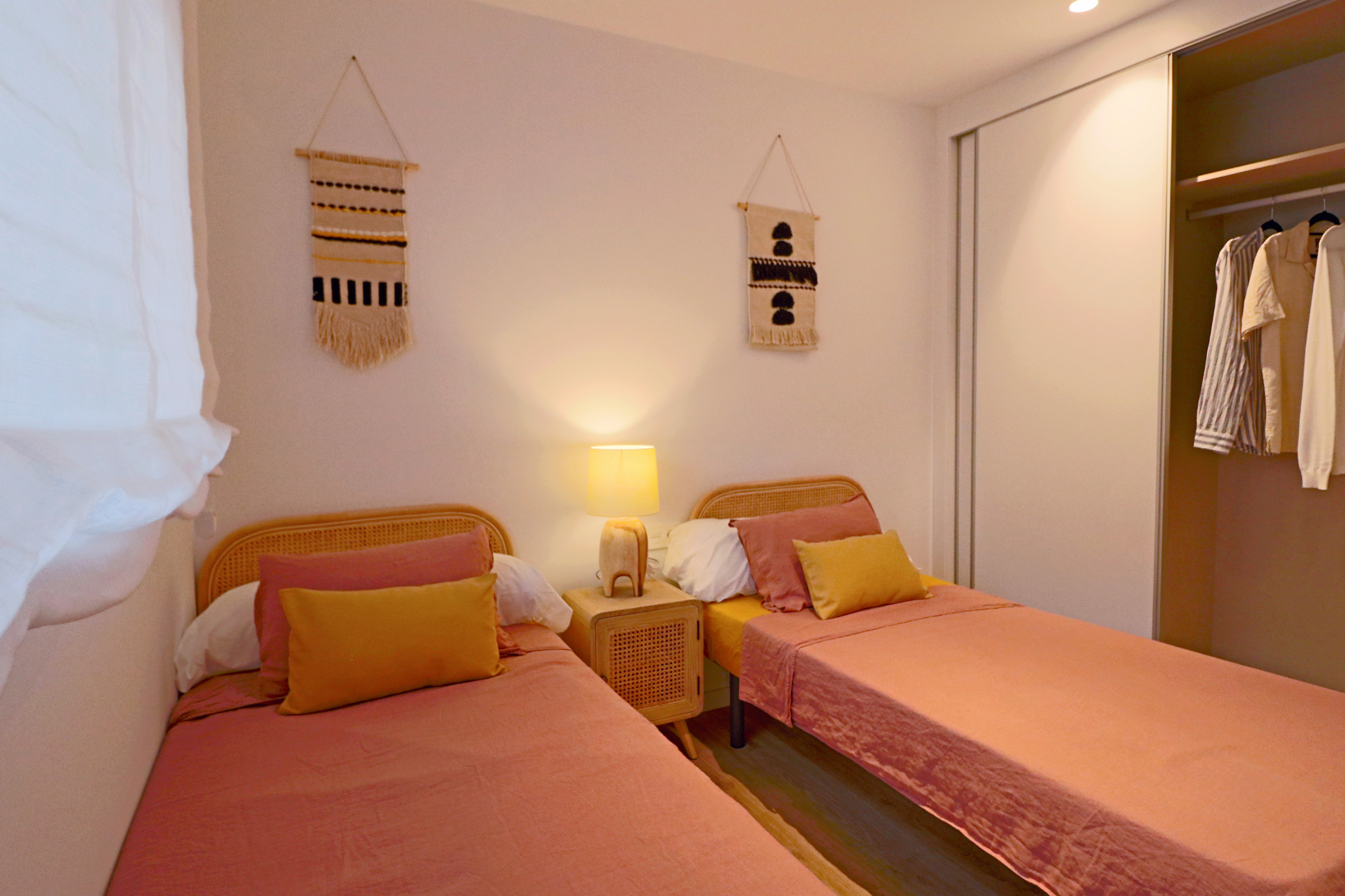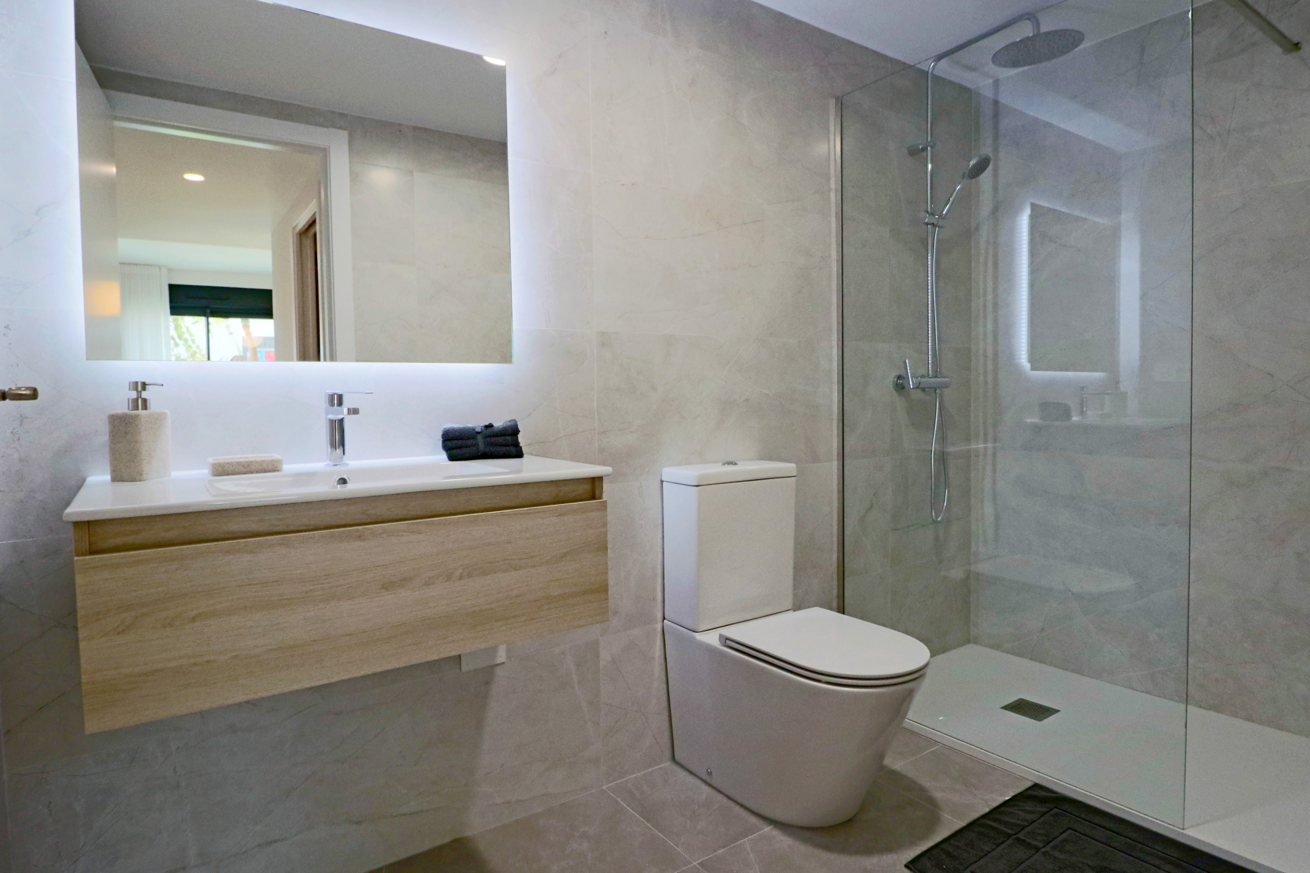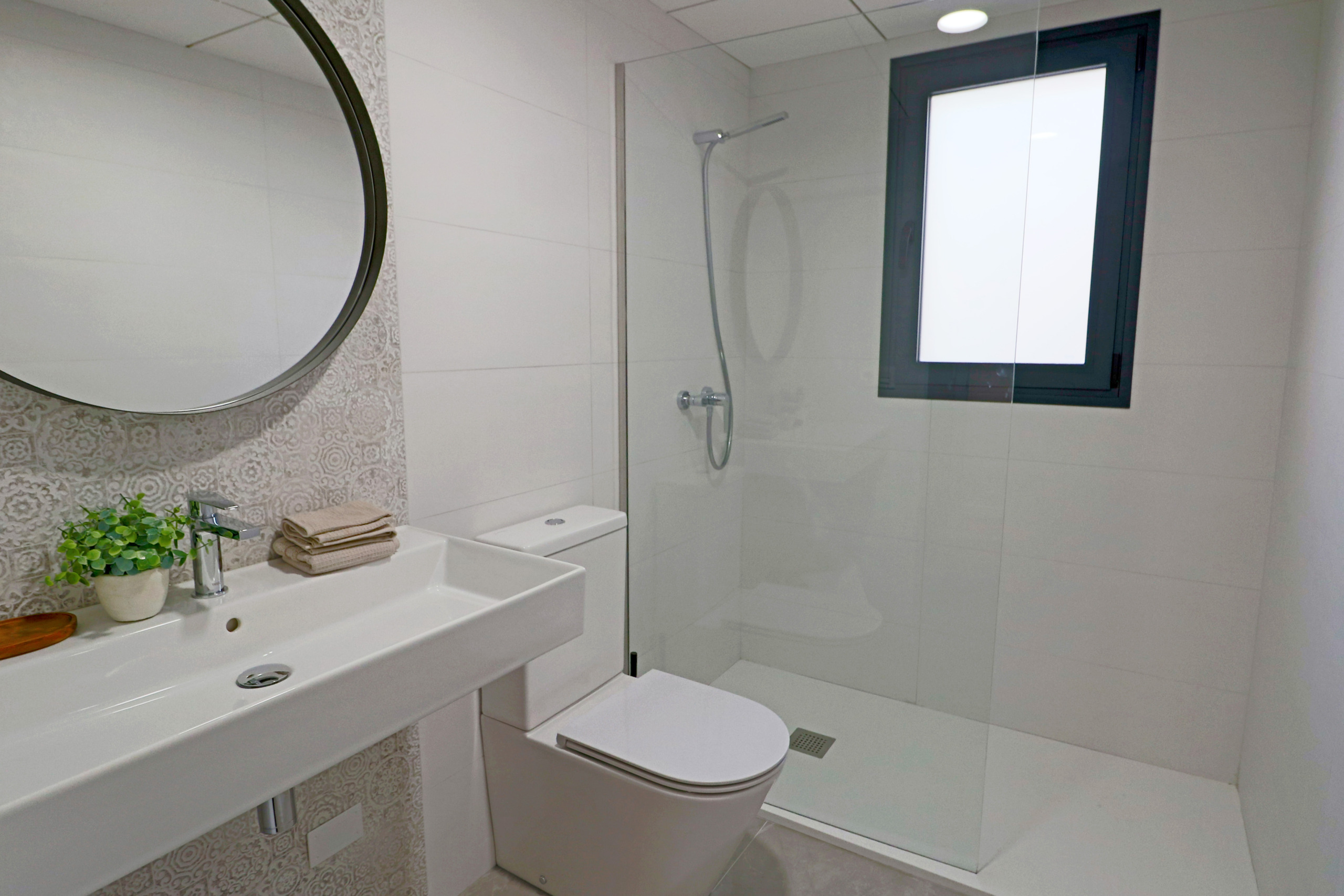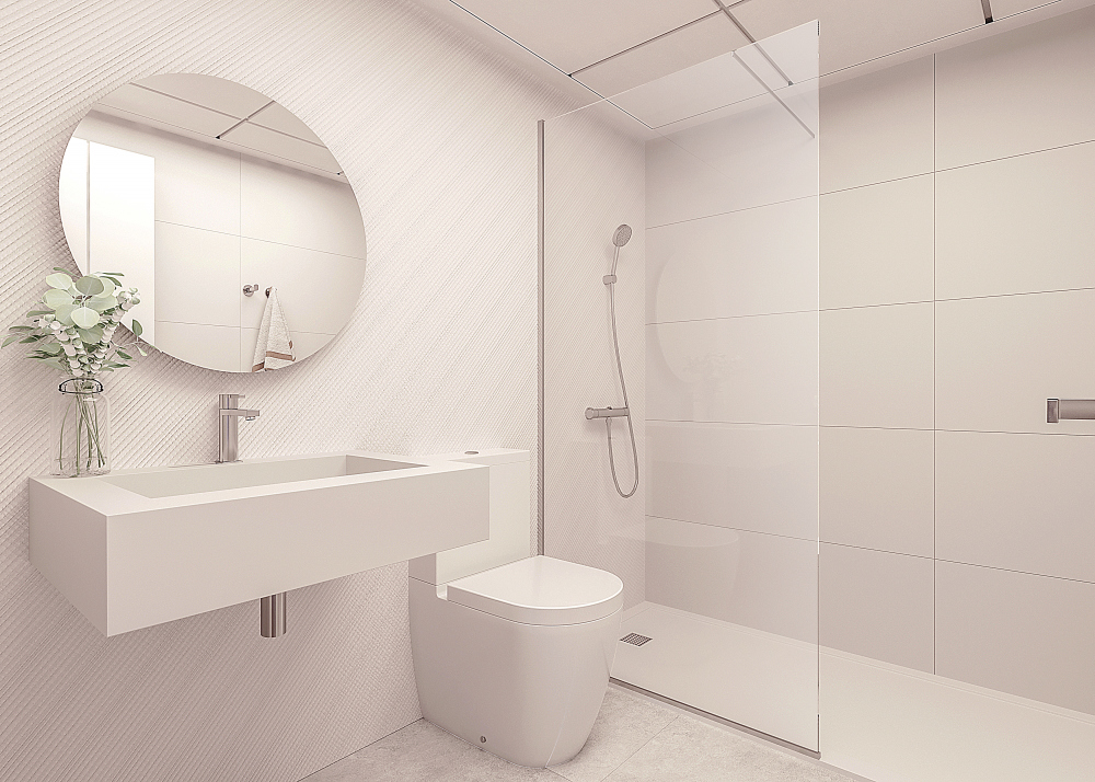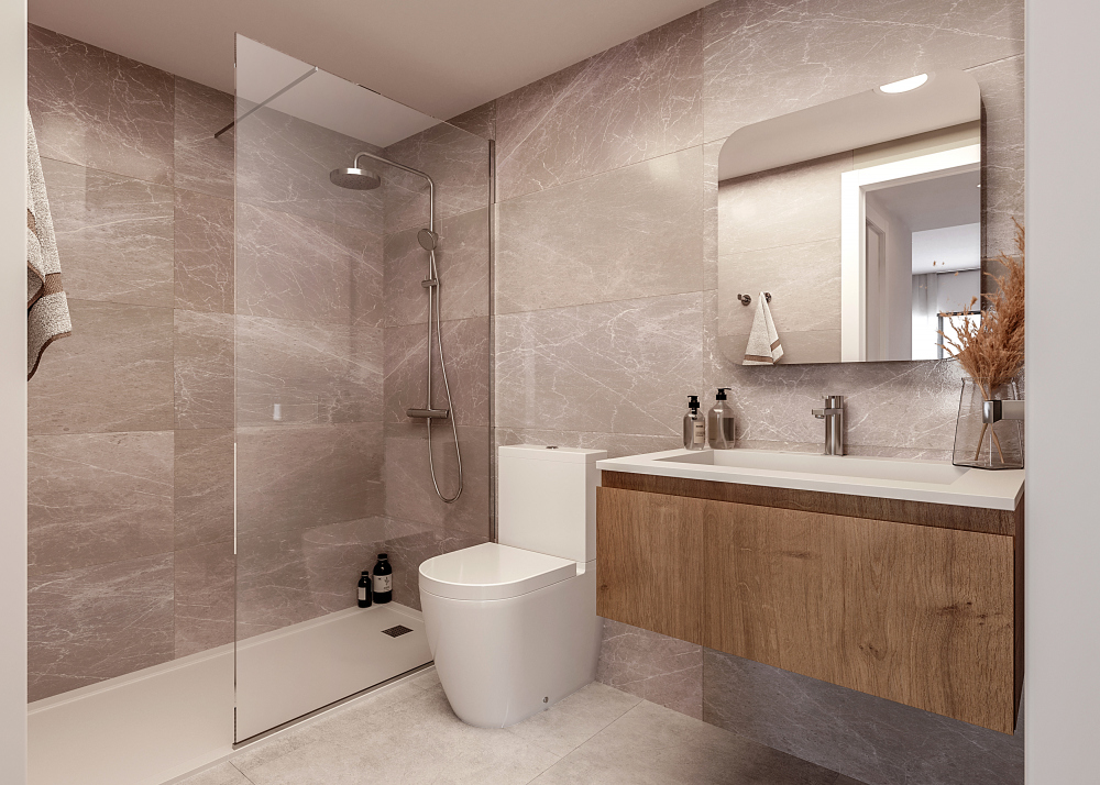 Die Wohnungen bestehen aus 2 oder 3 Schlafzimmern mit Einbauschränken und 2 Bädern. Beide Bäder sind mit einer Duschkabine und einem Waschbecken mit Schrank und Spiegel ausgestattet.