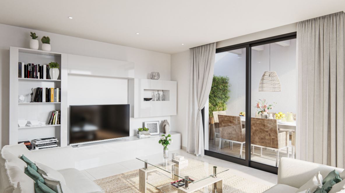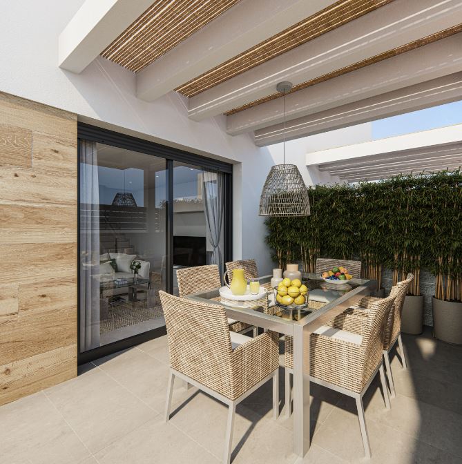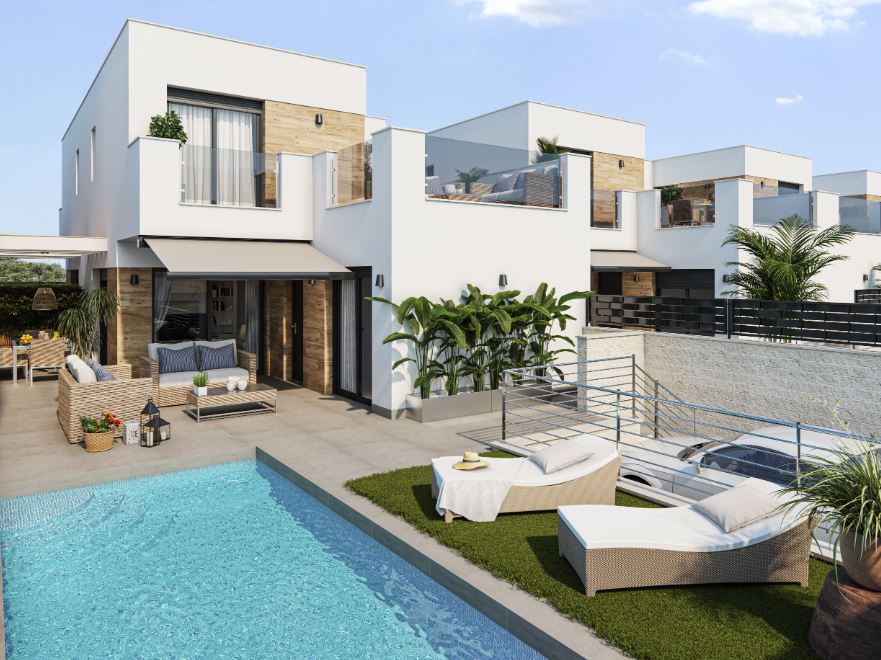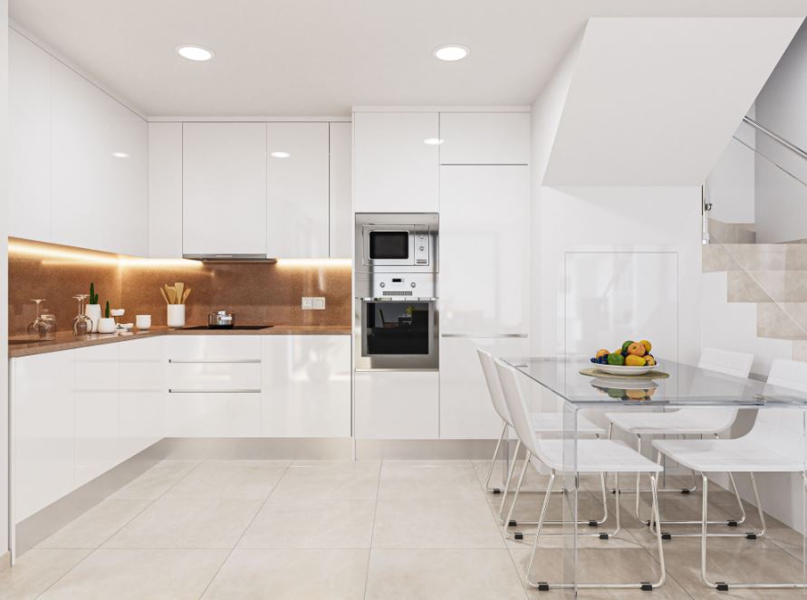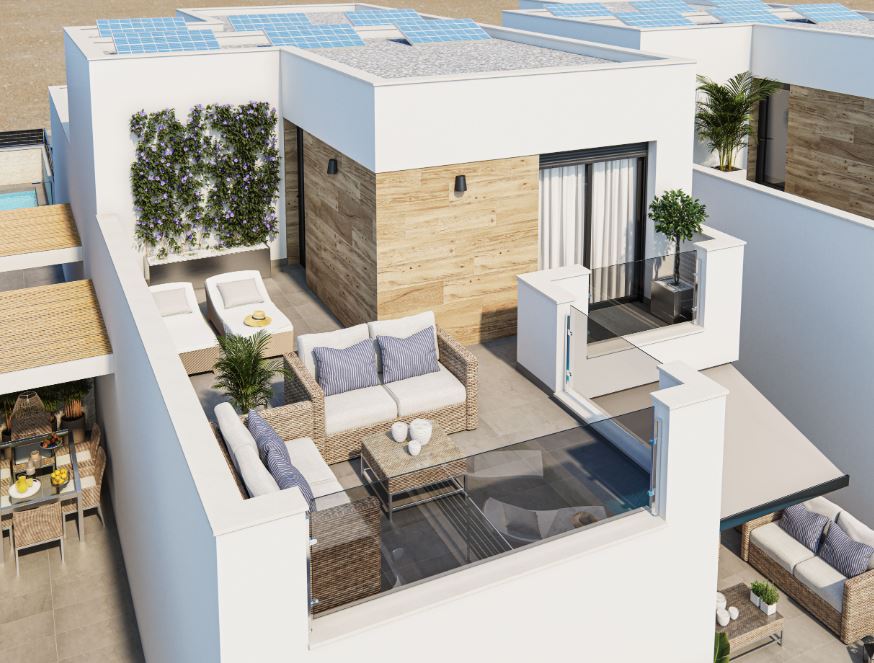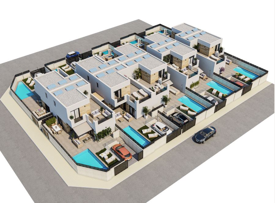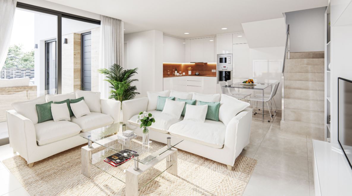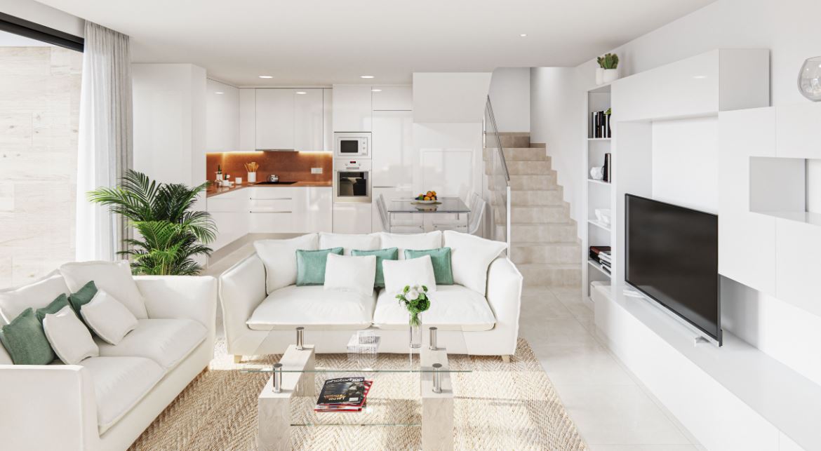 Die Häuser haben ein geräumiges Wohnzimmer im Erdgeschoss, von dem aus Sie den Außenbereich mit Terrassen und Pool zugreifen können. Die Küche wird komplett möbliert und mit einer Dunstabzugshaube geliefert. Auf dieser Etage befinden sich auch ein Schlafzimmer und ein Badezimmer.