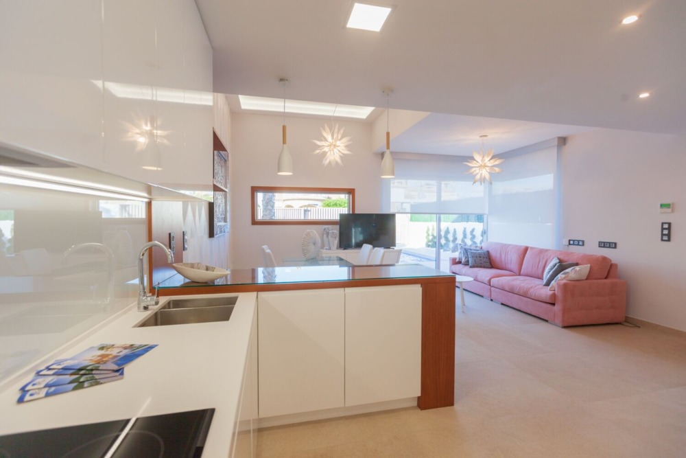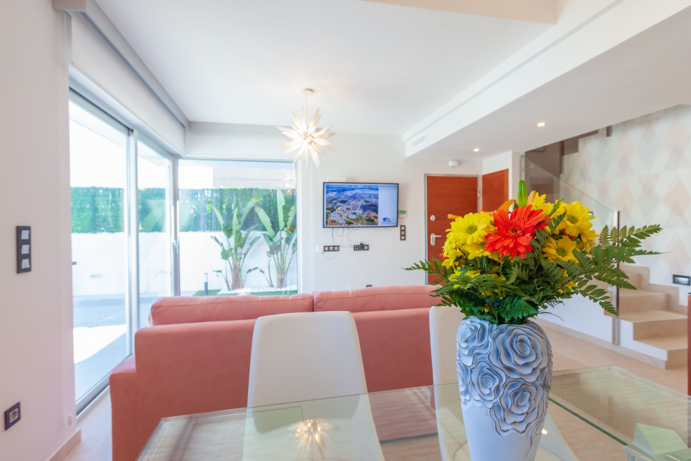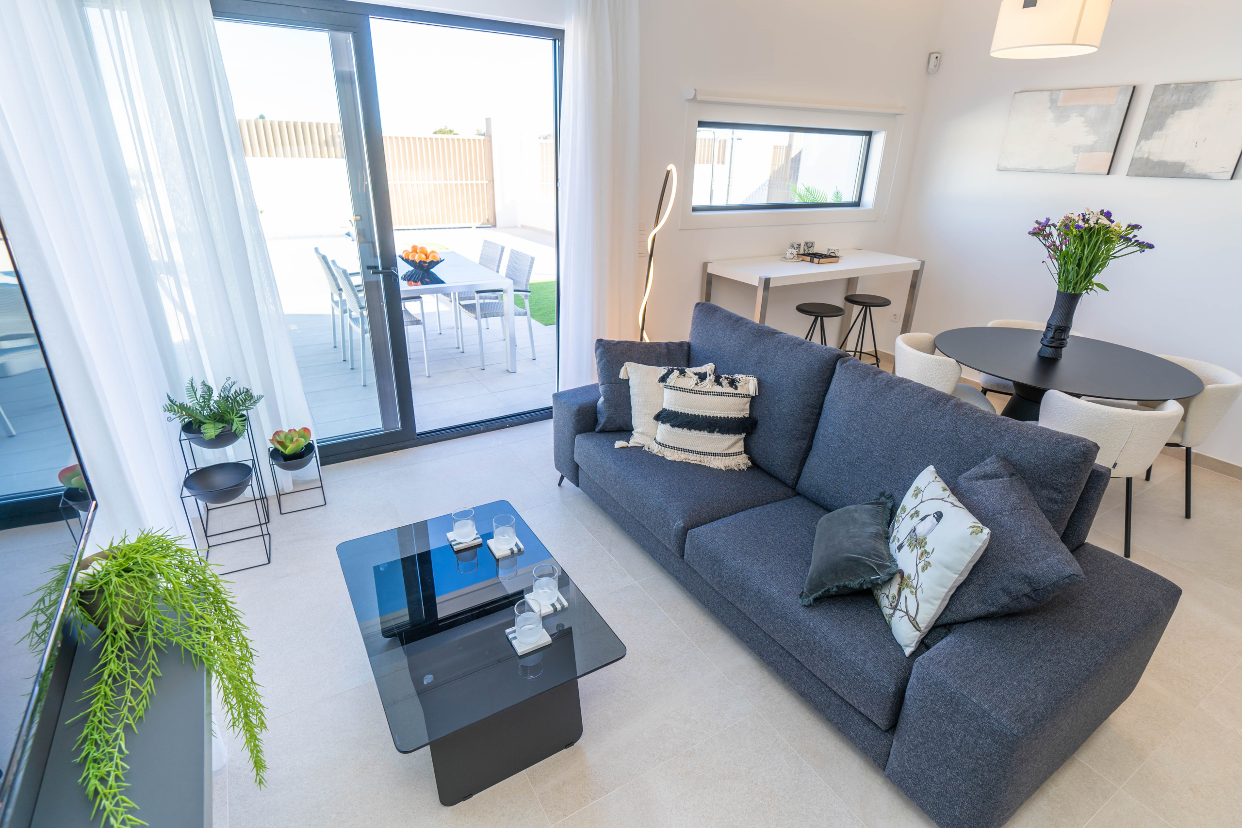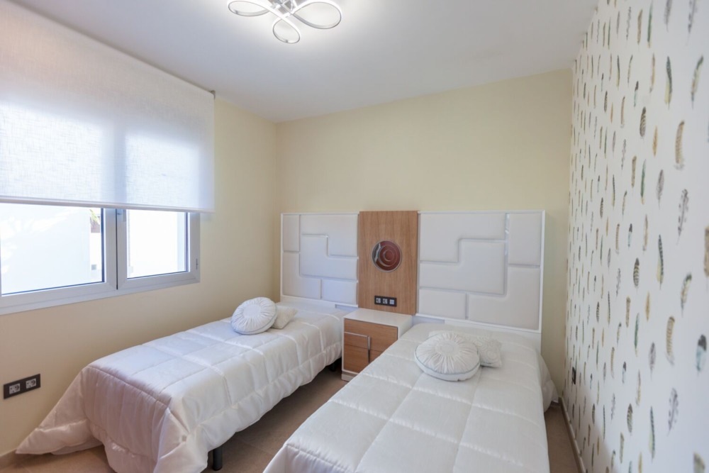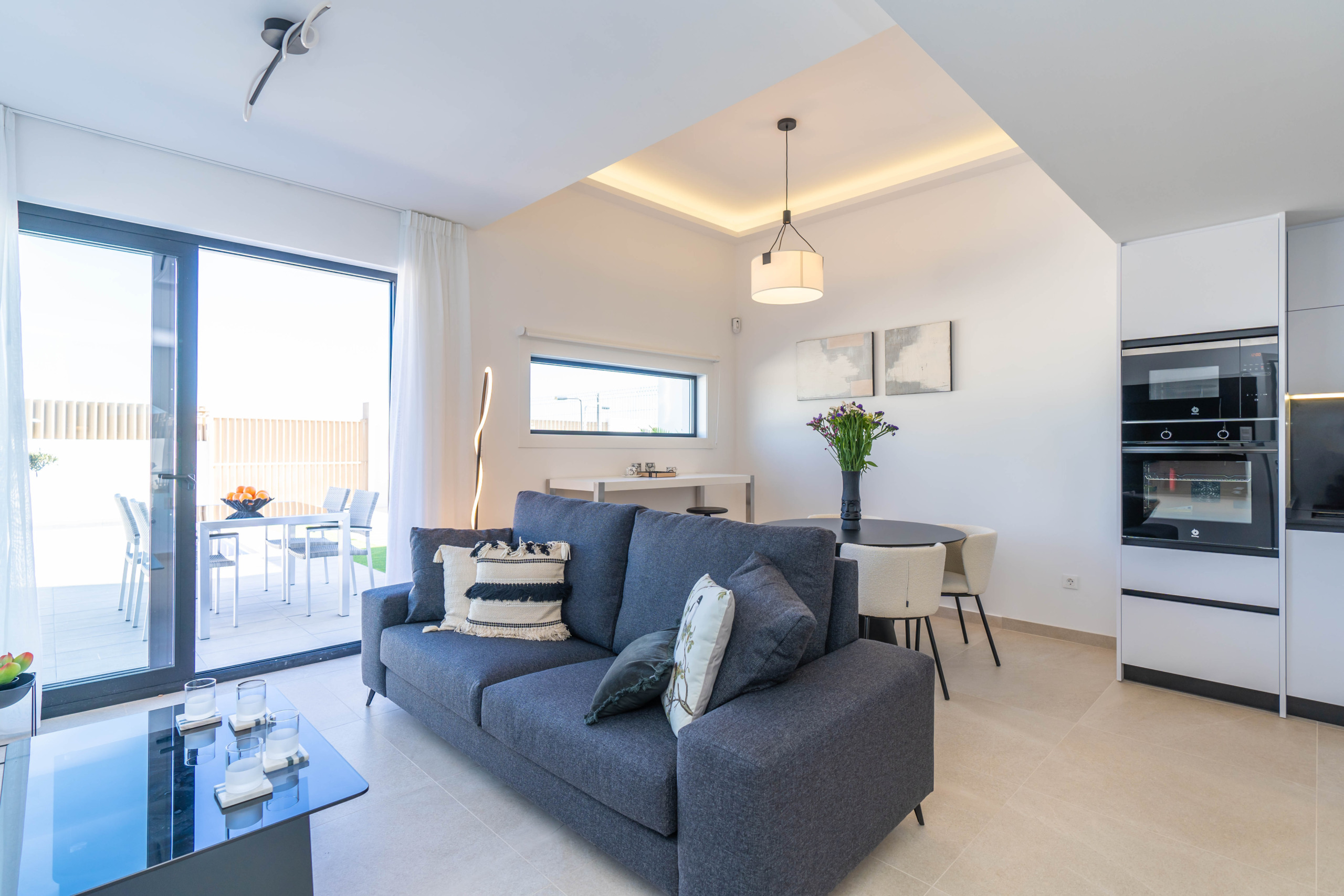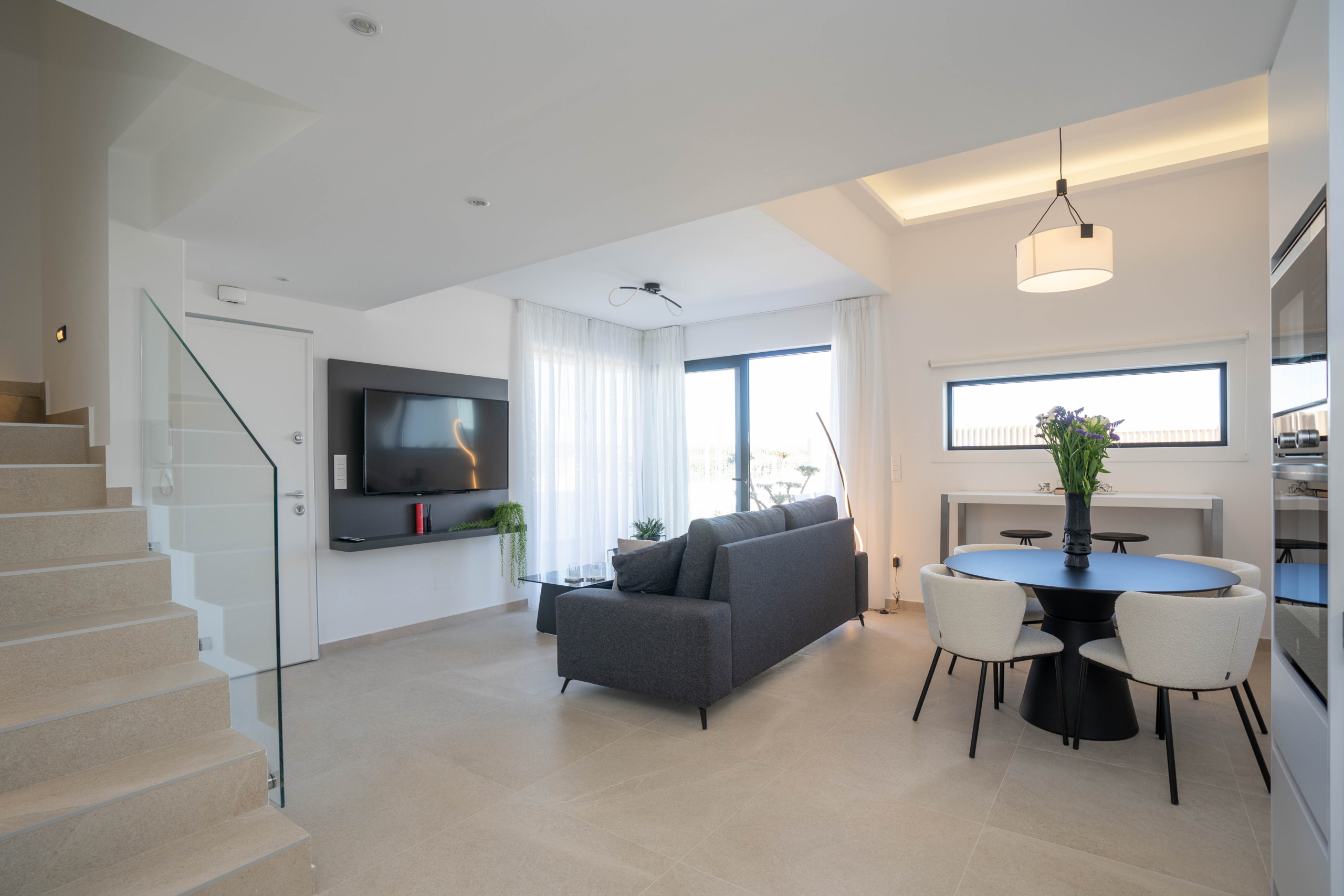 Jede Villa hat 3 Schlafzimmer mit Einbauschränken, das Hauptschlafzimmer befindet sich im Erdgeschoss und hat ein eigenes Bad. Die anderen 2 Schlafzimmer befinden sich im ersten Stock, zusammen mit dem 2. Die Schlafzimmer haben einen direkten Zugang zur Terrasse. Außerdem sind beide Bäder mit Fußbodenheizung, Duschabtrennung, Möbeln und Spiegeln ausgestattet. Die Villa hat auch ein schönes geräumiges Wohnzimmer mit doppelter Deckenhöhe und eine voll ausgestattete offene Küche.