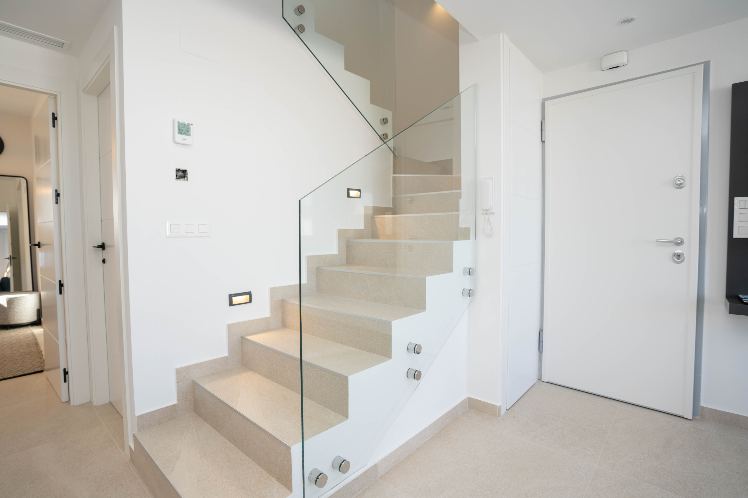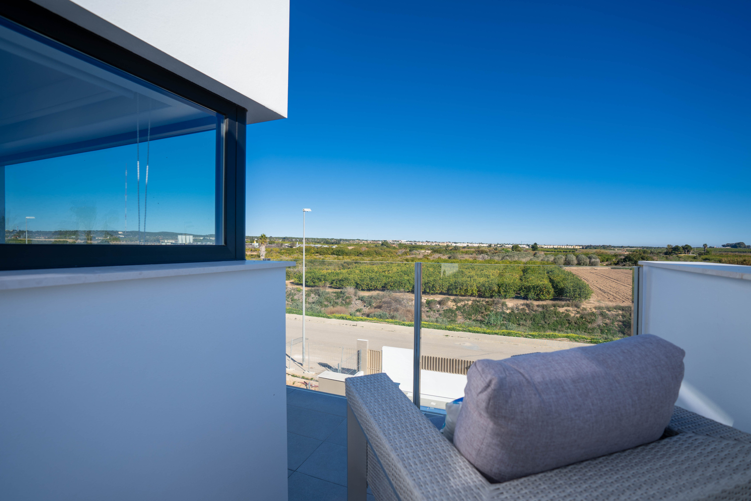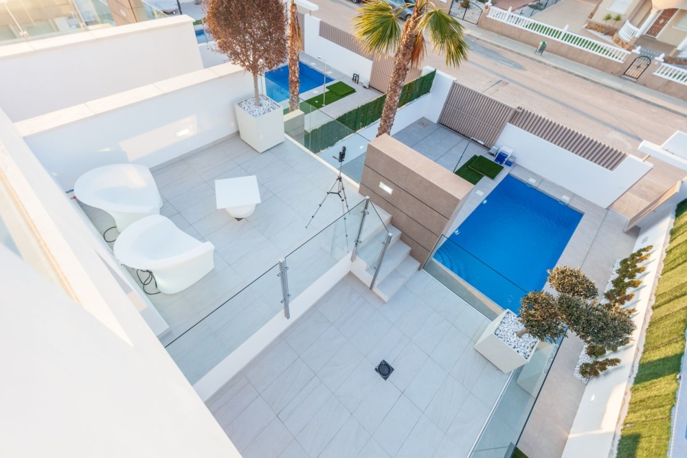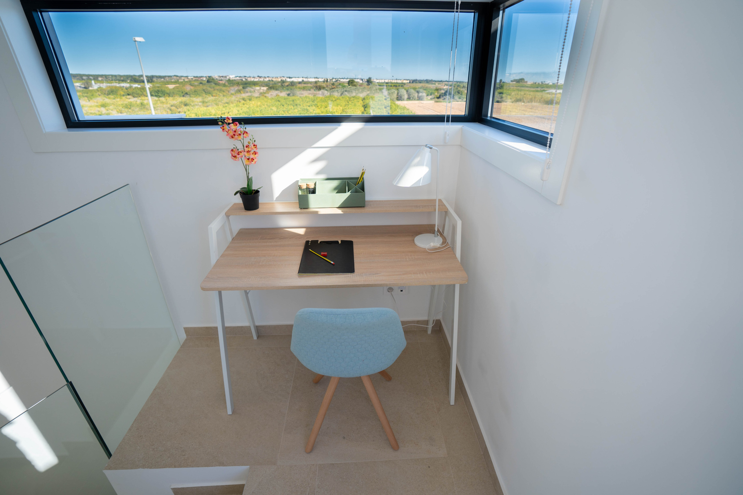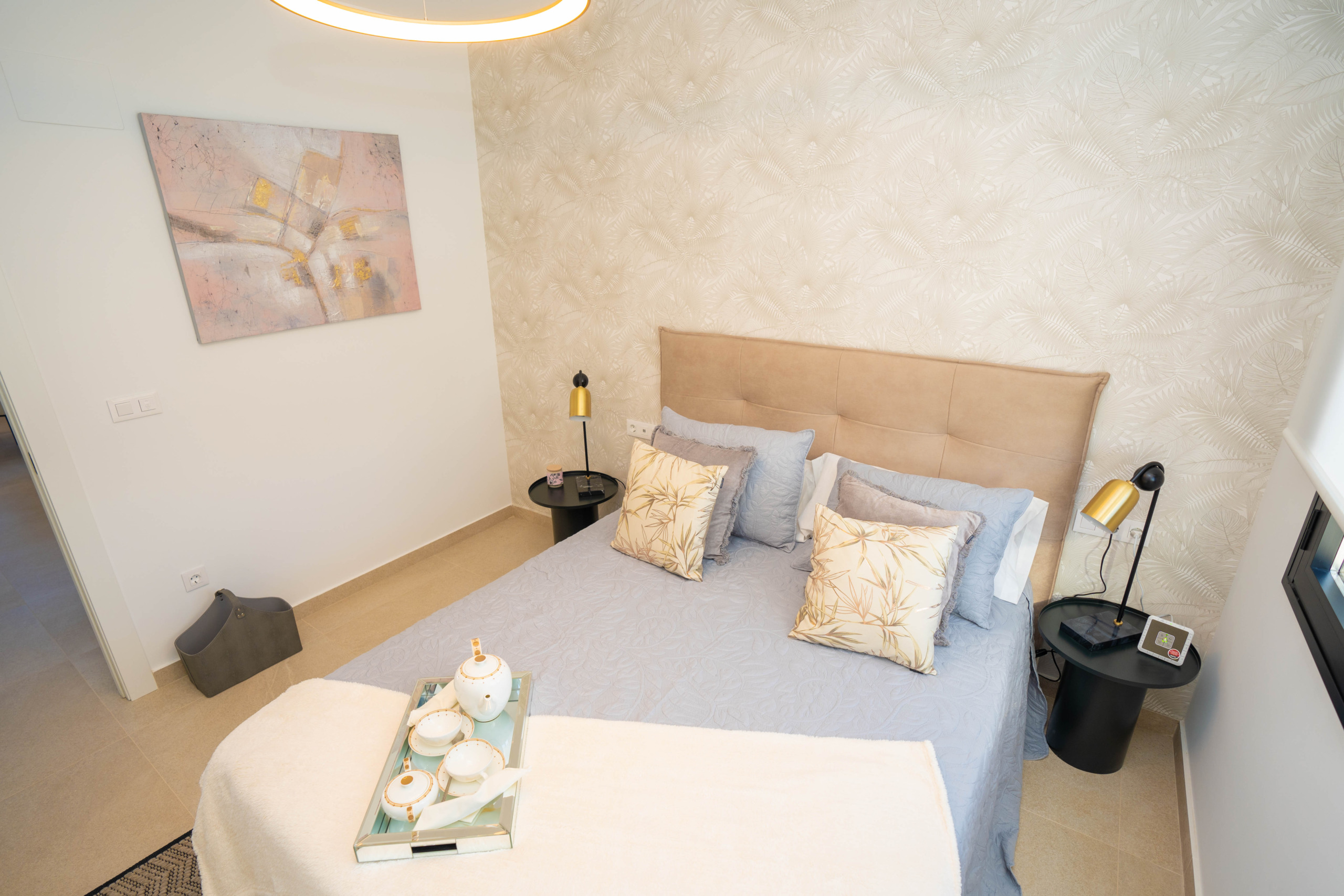Jede Villa hat 3 Schlafzimmer mit Einbauschränken, das Hauptschlafzimmer befindet sich im Erdgeschoss und hat ein eigenes Bad. Die anderen 2 Schlafzimmer befinden sich im ersten Stock, zusammen mit dem 2. Die Schlafzimmer haben einen direkten Zugang zur Terrasse. Außerdem sind beide Bäder mit Fußbodenheizung, Duschabtrennung, Möbeln und Spiegeln ausgestattet. Die Villa hat auch ein schönes geräumiges Wohnzimmer mit doppelter Deckenhöhe und eine voll ausgestattete offene Küche.