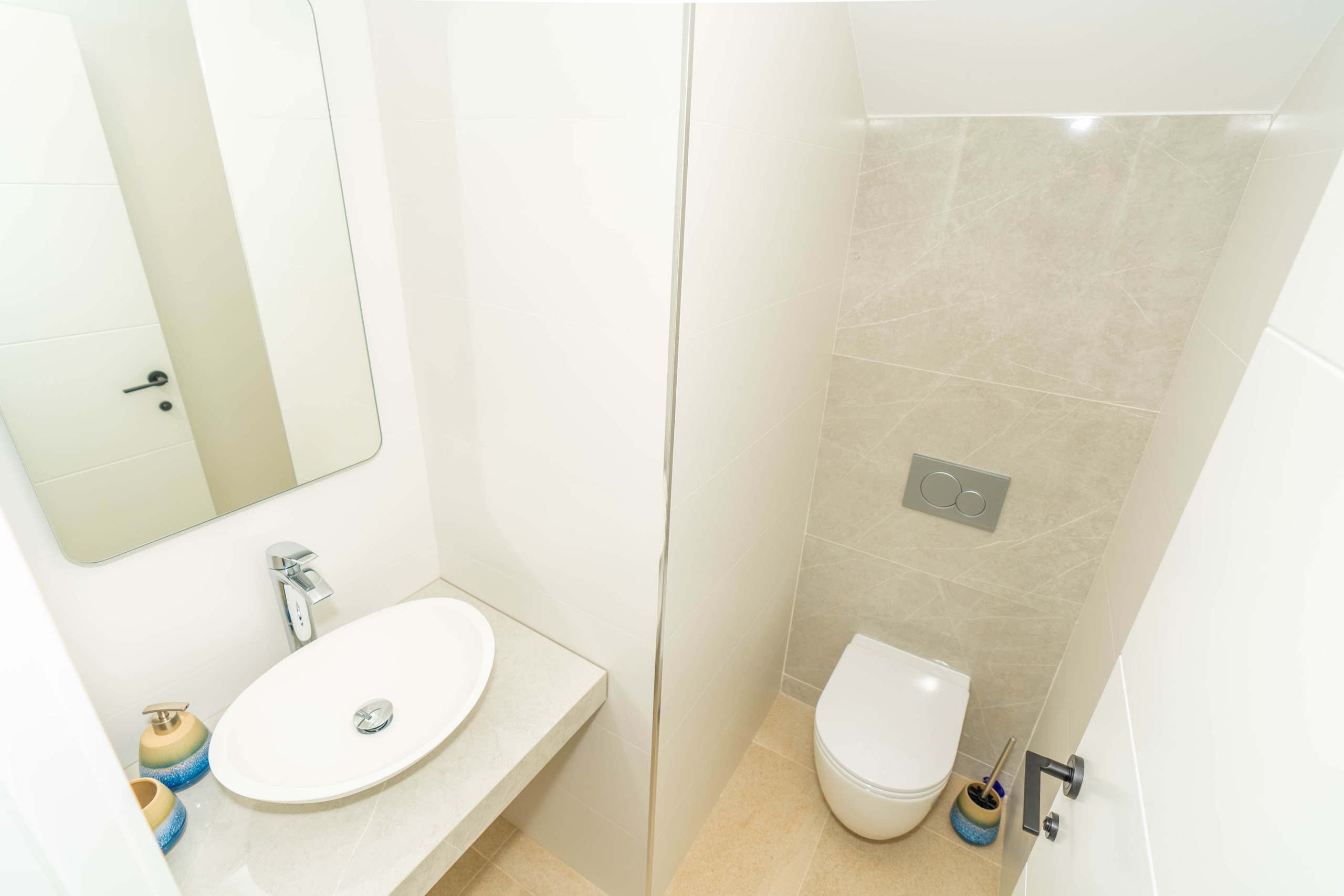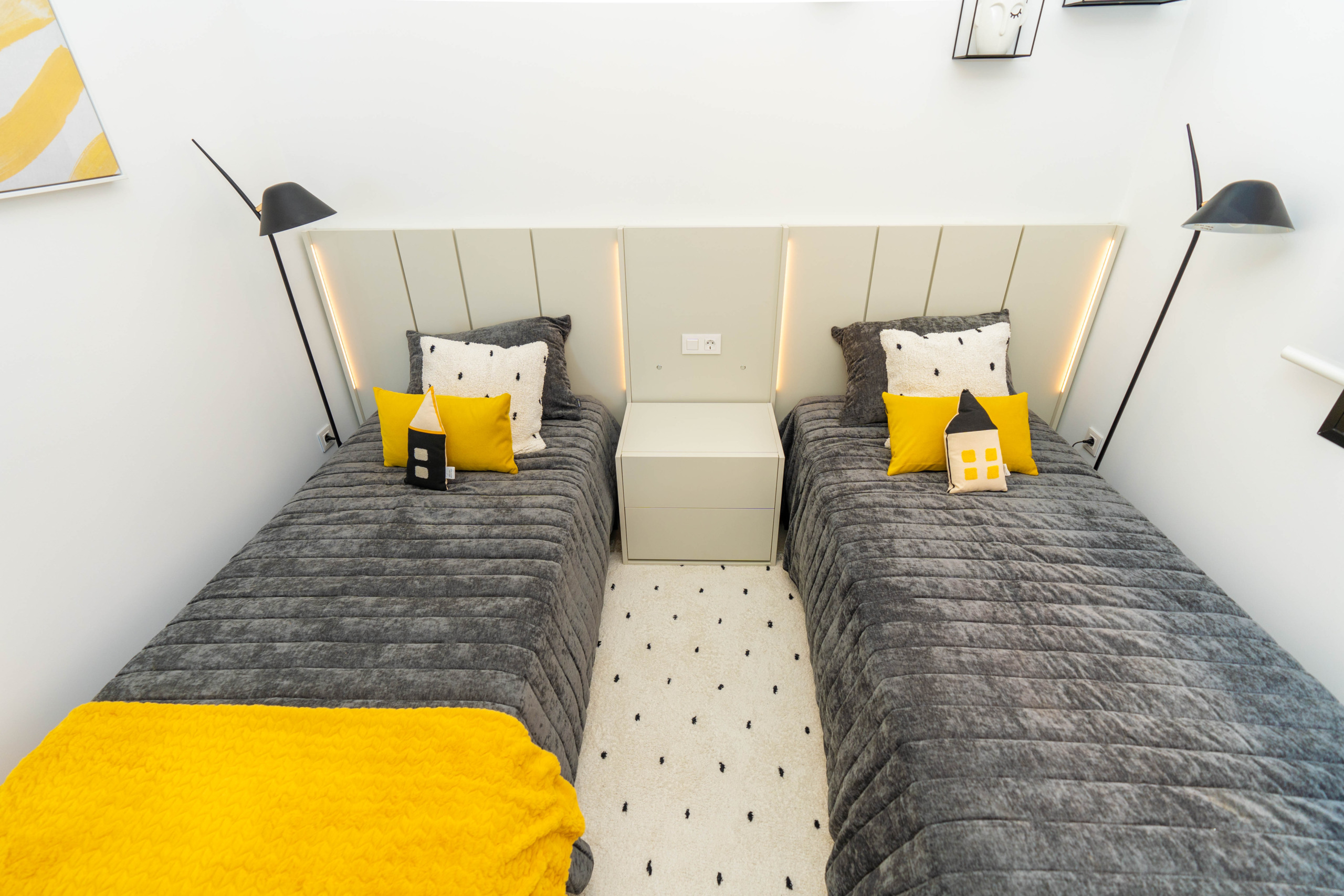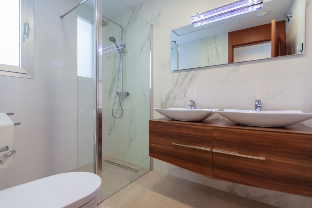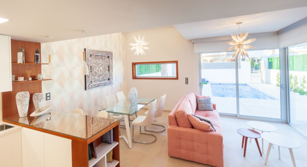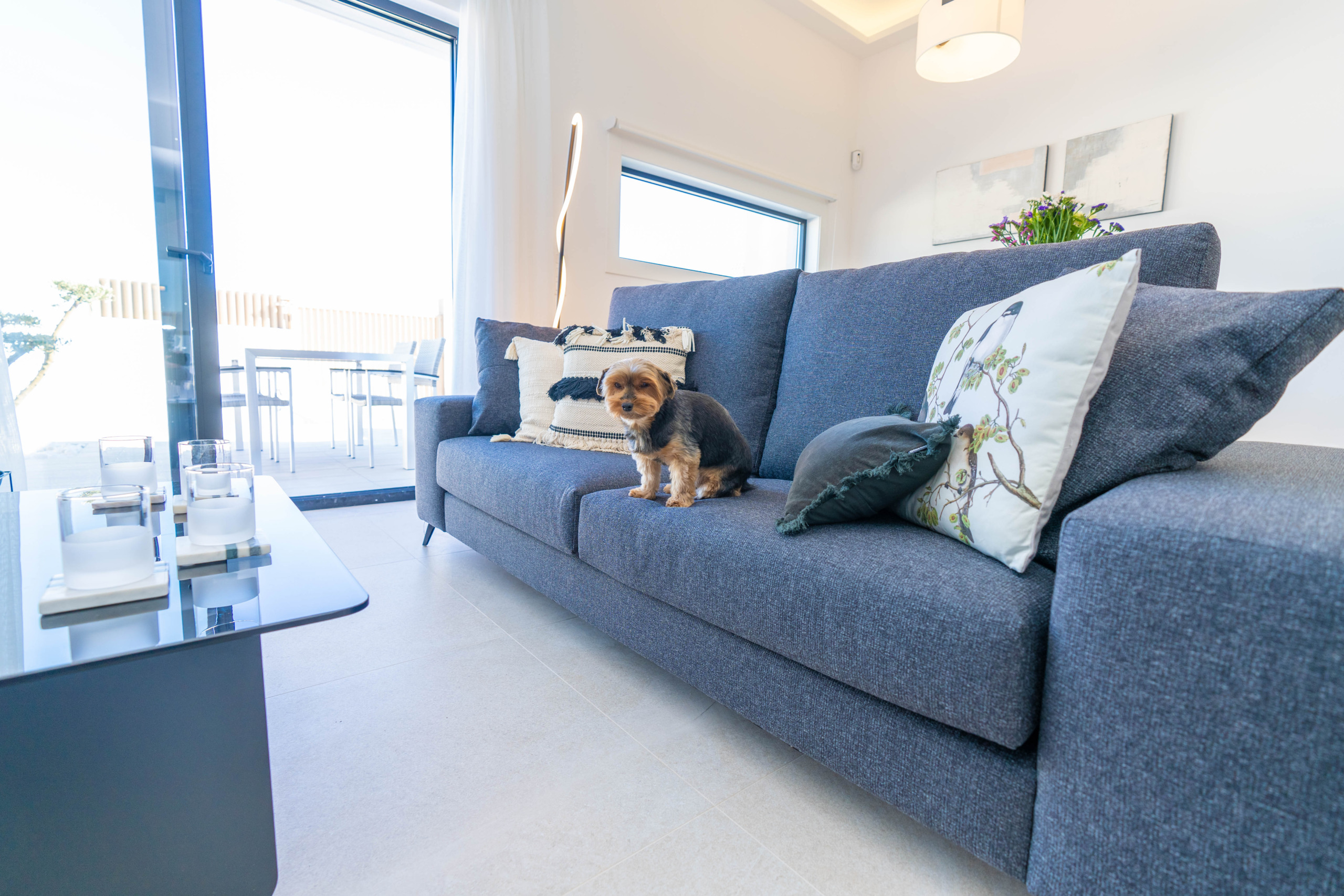 Jede Villa hat 3 Schlafzimmer mit Einbauschränken, das Hauptschlafzimmer befindet sich im Erdgeschoss und hat ein eigenes Bad. Die anderen 2 Schlafzimmer befinden sich im ersten Stock, zusammen mit dem 2. Die Schlafzimmer haben einen direkten Zugang zur Terrasse. Außerdem sind beide Bäder mit Fußbodenheizung, Duschabtrennung, Möbeln und Spiegeln ausgestattet. Die Villa hat auch ein schönes geräumiges Wohnzimmer mit doppelter Deckenhöhe und eine voll ausgestattete offene Küche.