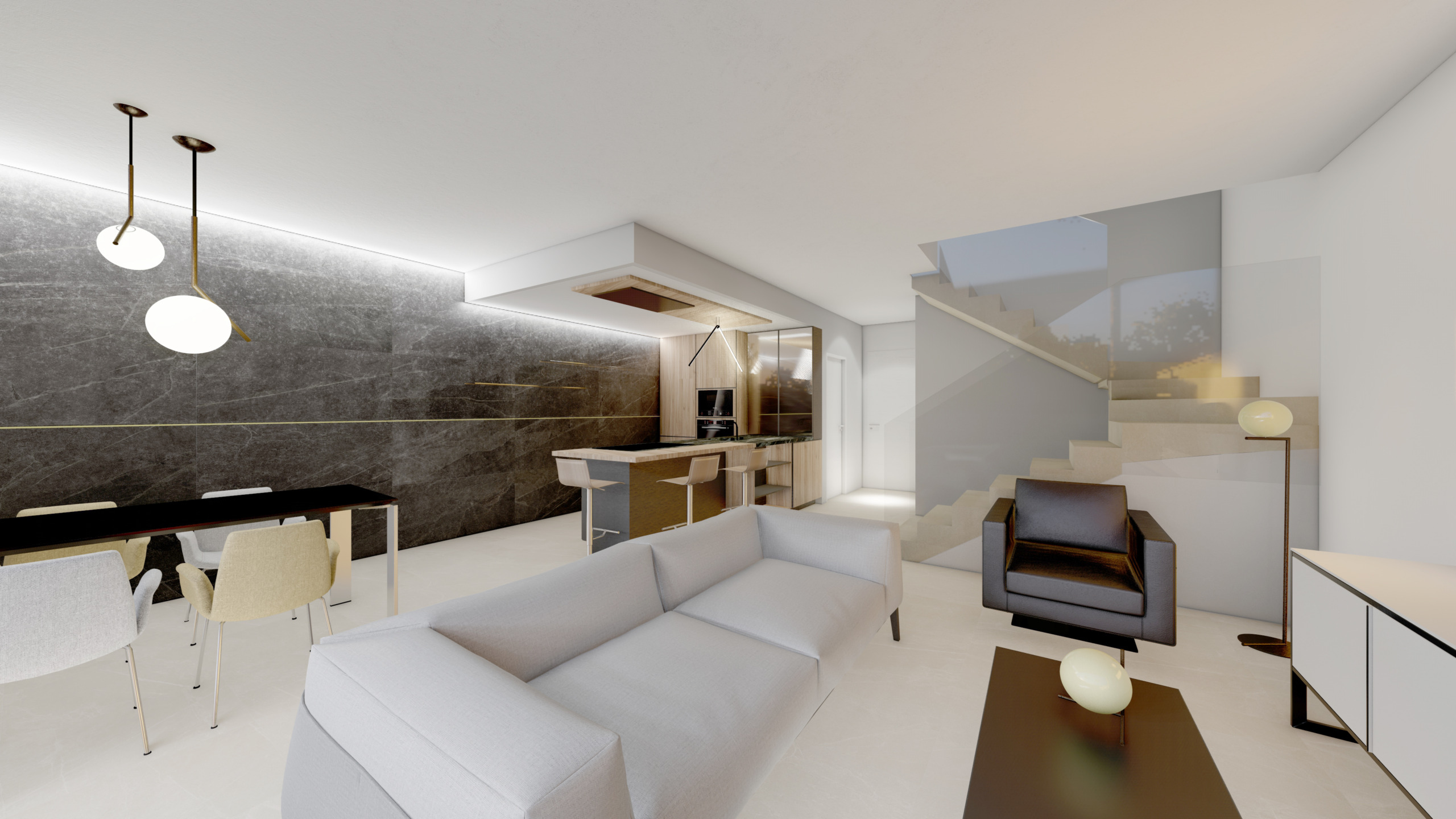 Das Erdgeschoss besteht aus einem geräumigen Wohn-Esszimmer mit offener Küche, einem Schlafzimmer, einem Badezimmer und einer Veranda. Die Küche wird komplett mit Ober- und Unterschränken sowie Elektrogeräten ausgestattet geliefert.