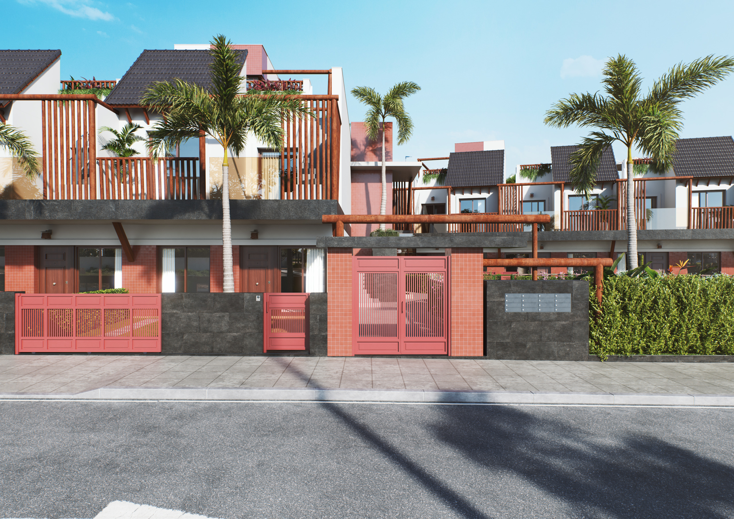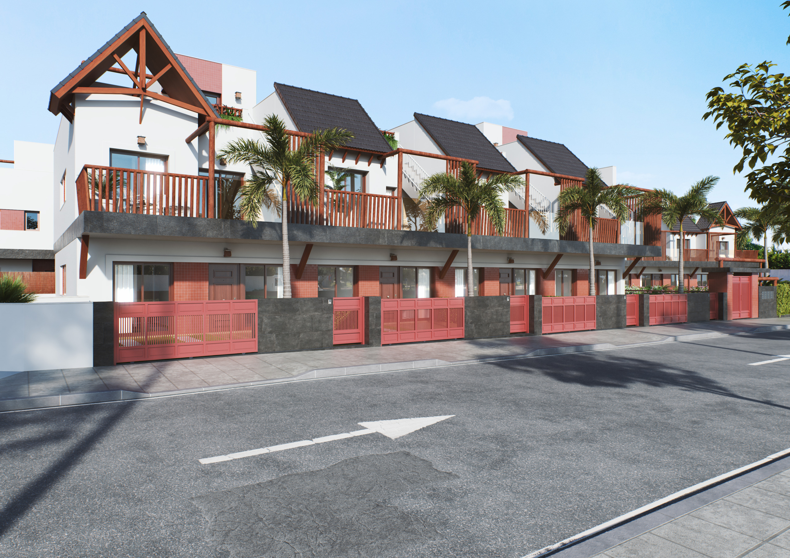 Es verfügt über großzügige Außenbereiche wie Parkplätze für jedes der Häuser, Gemeinschaftspool und Terrasse.