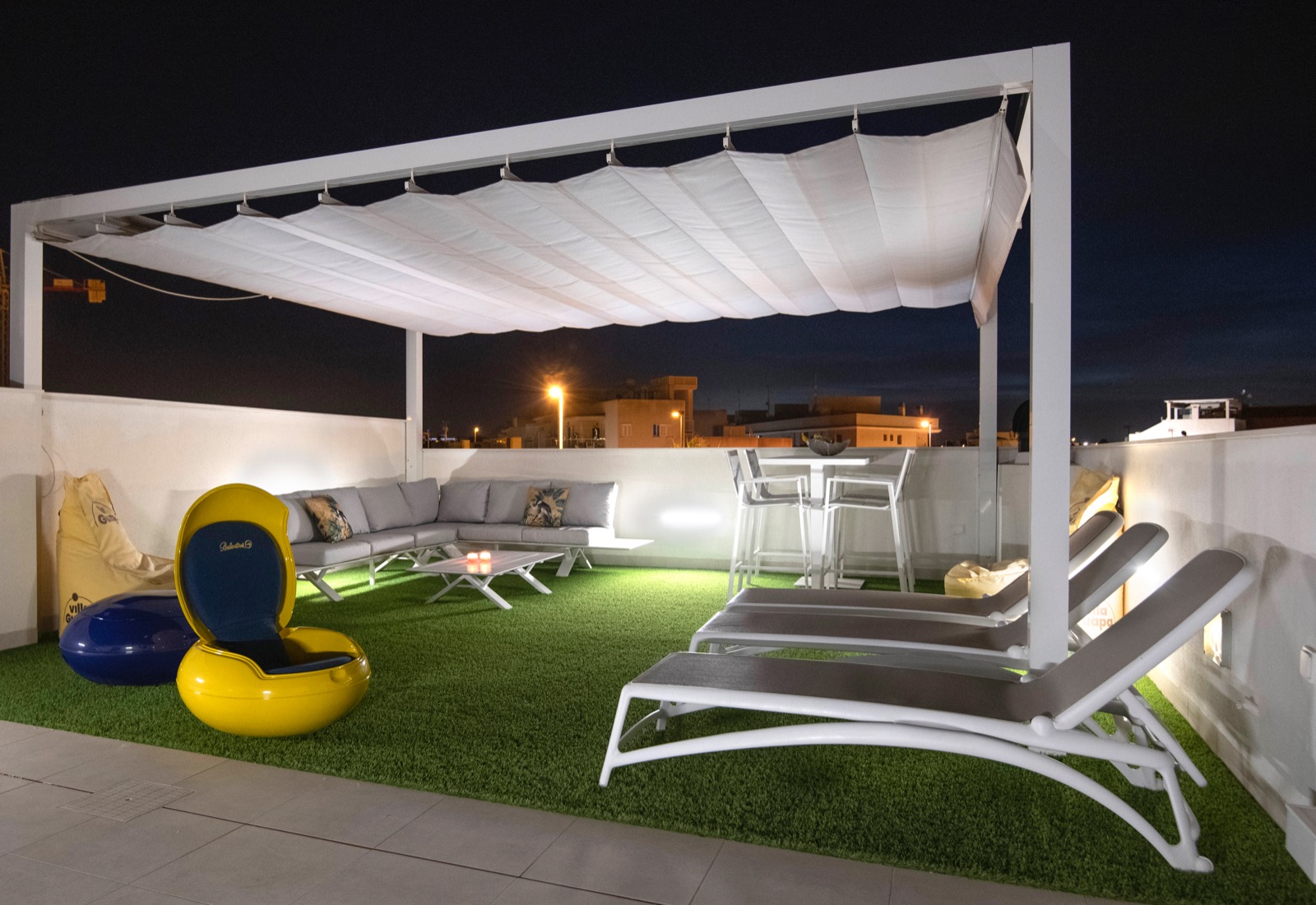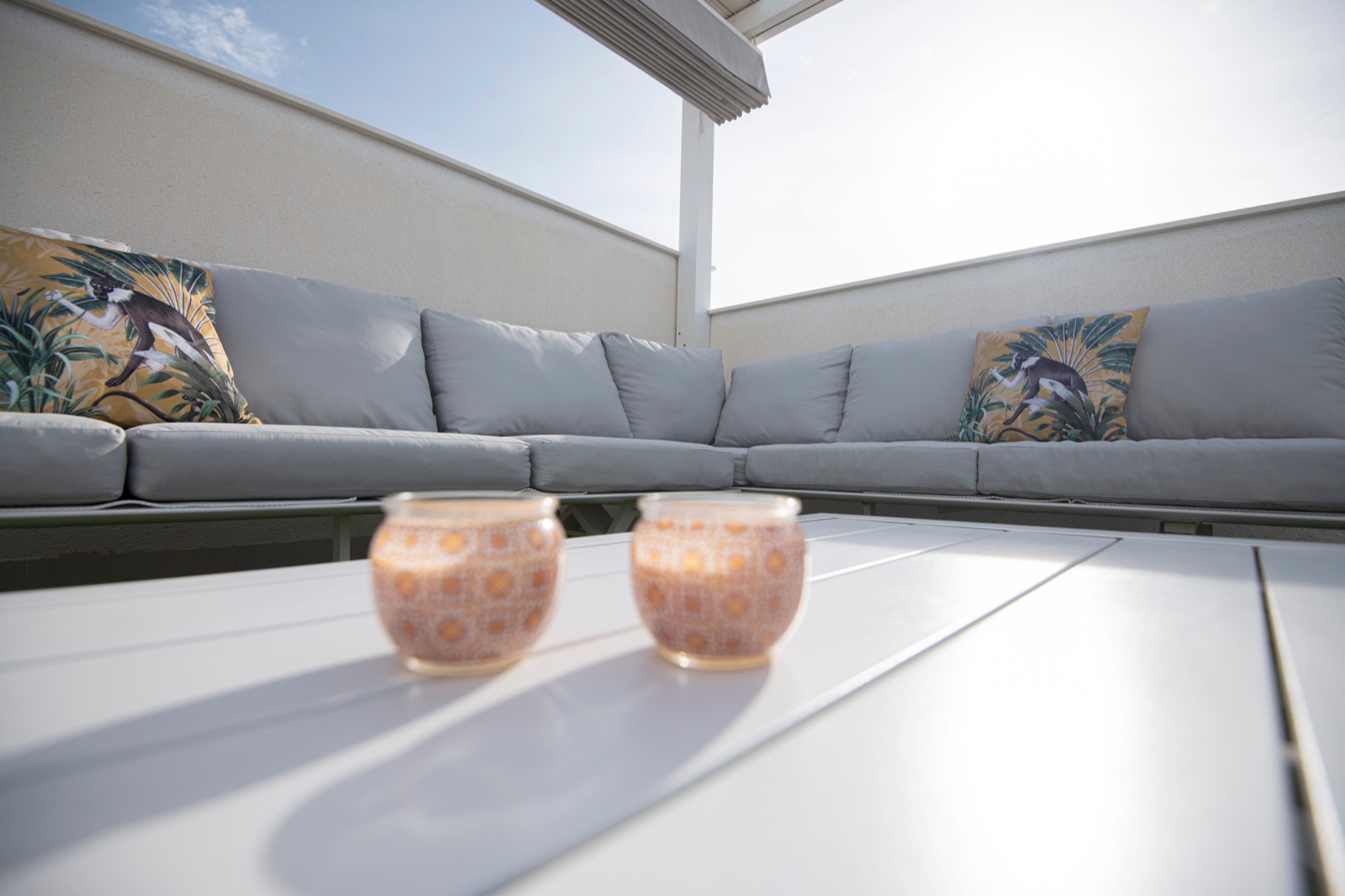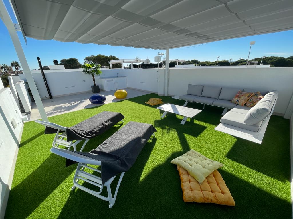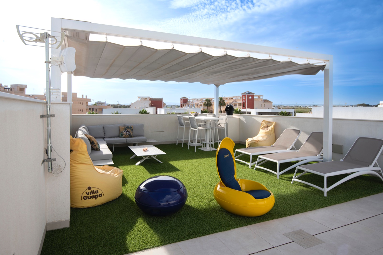 Dachterrasse (Solarium) von 45 m2 mit Sommerküche, Solardusche und großer Markise (Pergola) mit schönem Panoramablick