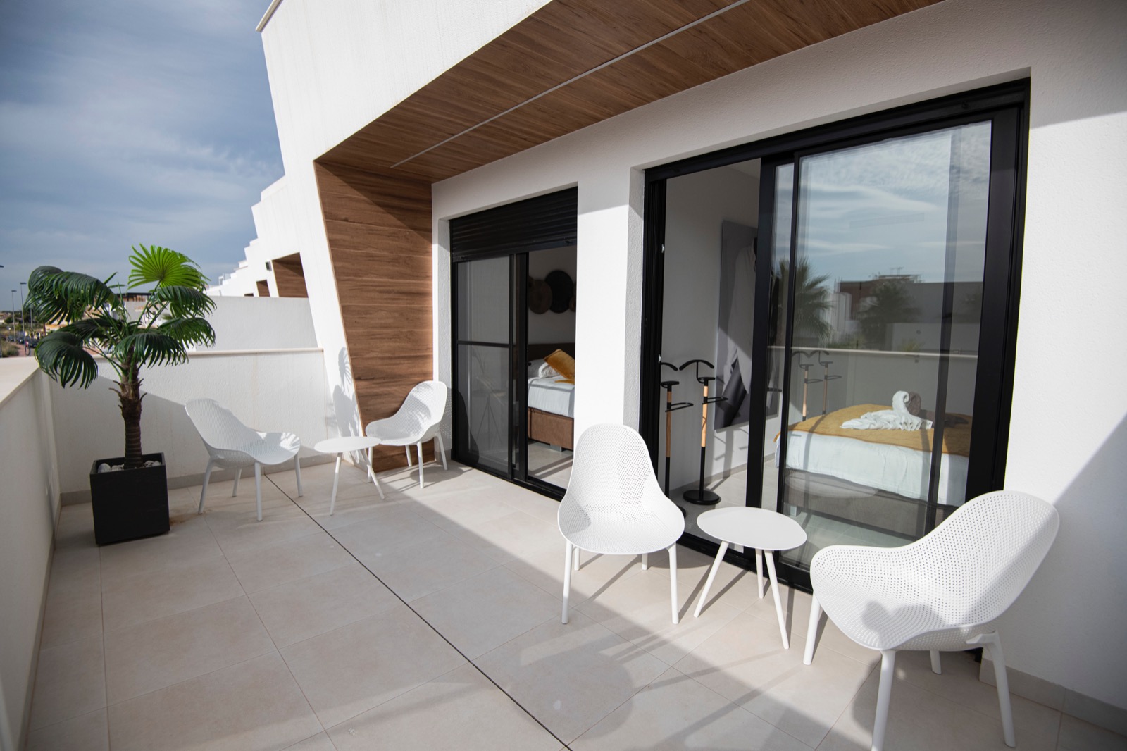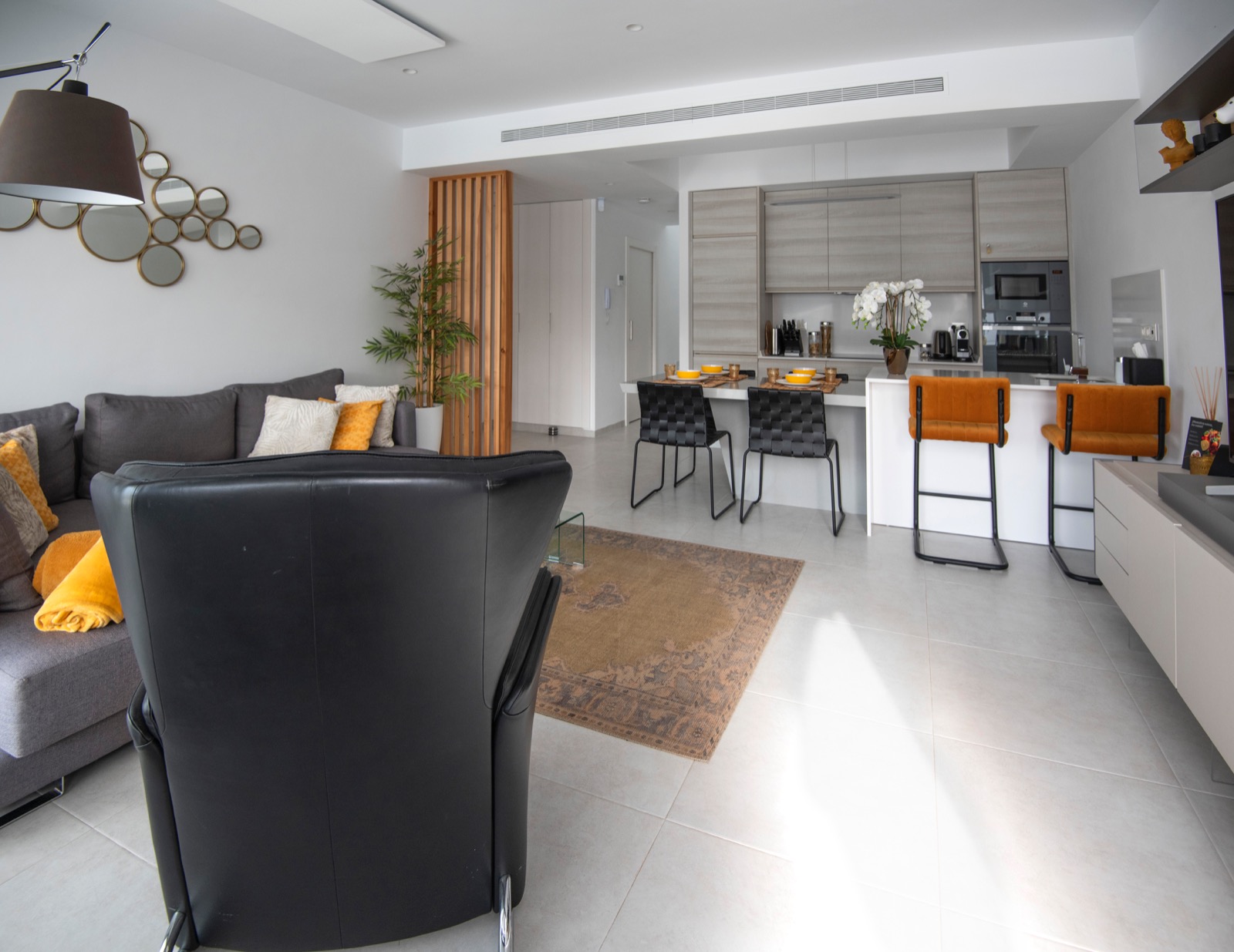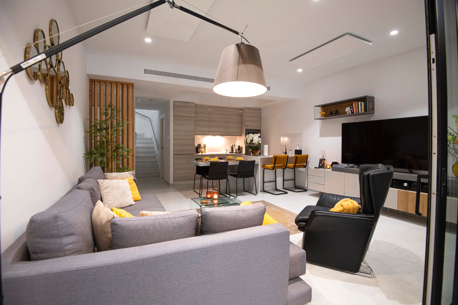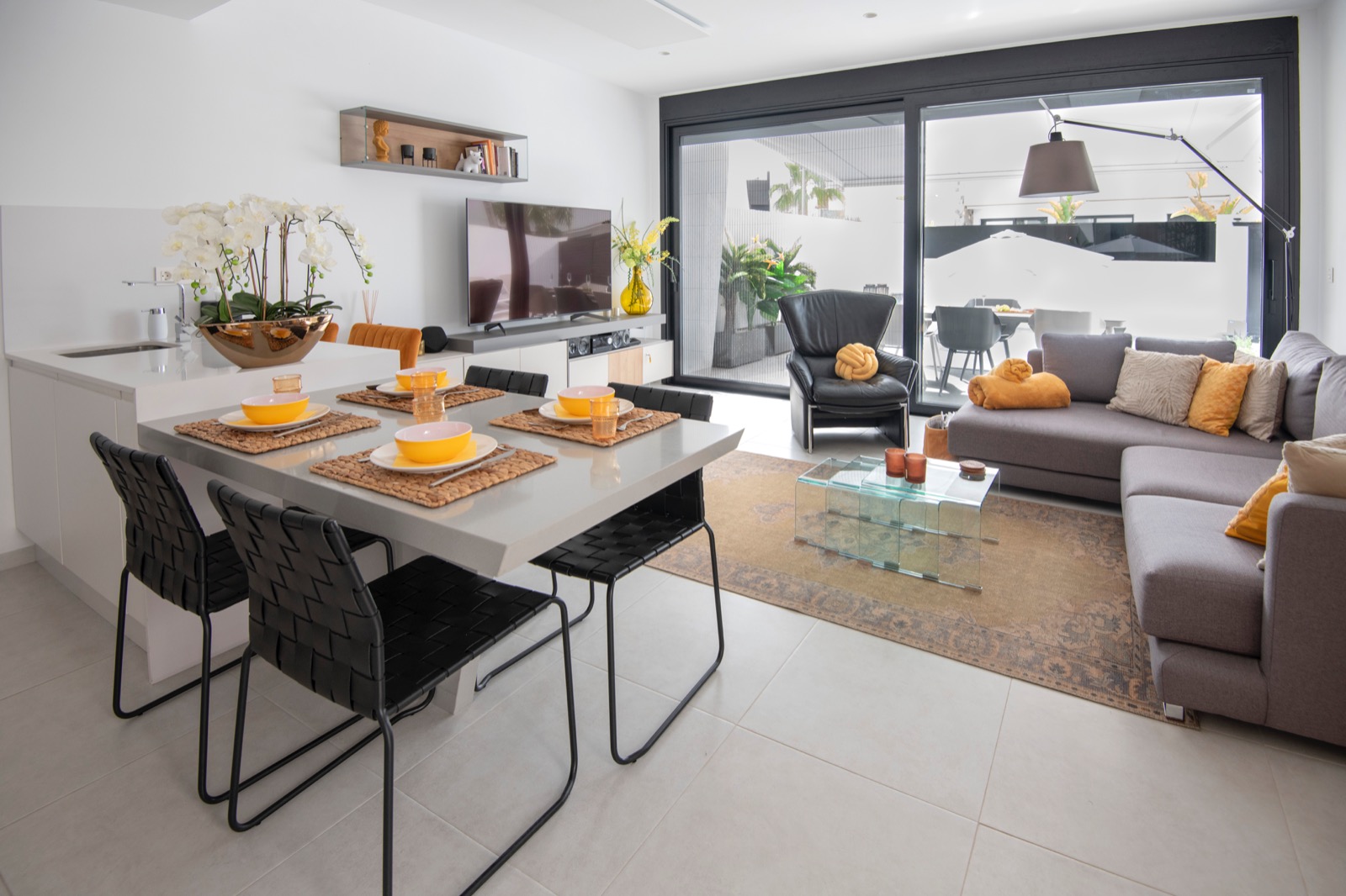 Geräumiges, modernes und helles Wohnzimmer mit Glasschiebetüren, die direkten Zugang zu einer großen Terrasse bieten. Das Wohnzimmer und die Küche haben eine zusätzliche Infrarotheizung an der Decke für die Wintermonate.