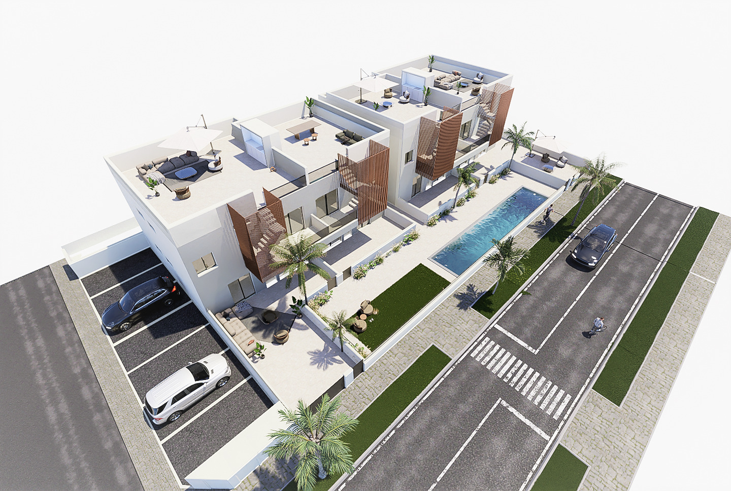 Im Außenbereich gibt es einen Gemeinschaftspool mit Entspannungsbereich mit Sonnenliegen, eine Sonnenterrasse mit Sommerküche oder einen privaten Garten.