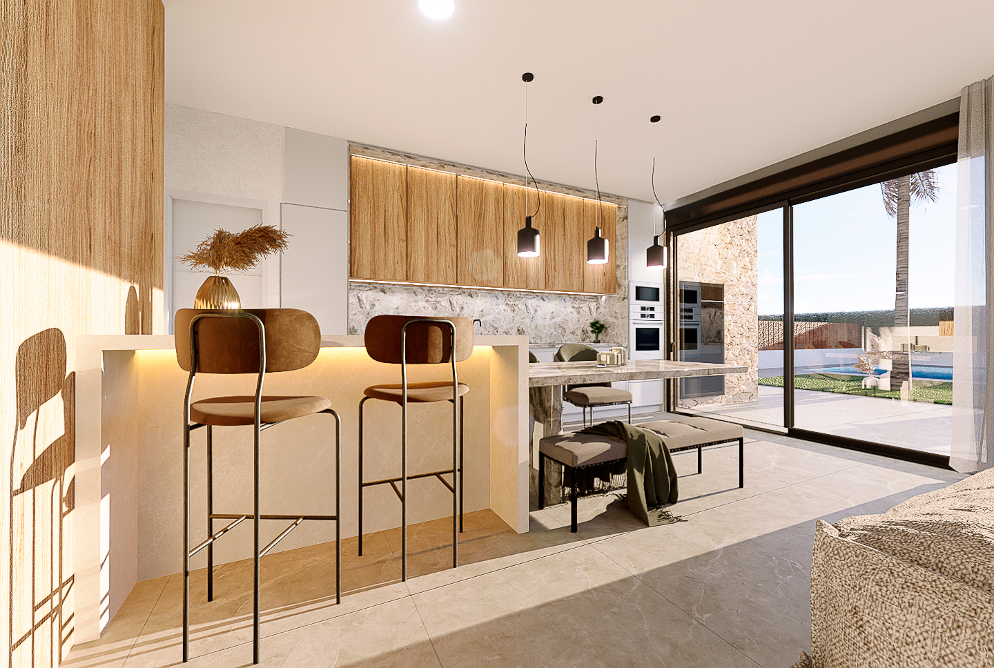 Die Villen sind auf einer Etage mit geräumigen Schlafzimmern und Bädern mit einem exklusiven und modernen Design, große Außenräume einschließlich einer Terrasse, Solarium, Garten, privatem Pool und privatem Parkplatz für mehrere Autos verteilt.